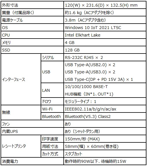 最新OS Windows10 IoT 2021 LTSCを採用し、豊富な通信機能(LAN, Wi-Fi,Bluetooth)と汎用インターフェースを内蔵しているため、タブレットPOS端末や決済端末、レシートプリンタ端末として利用が可能です。