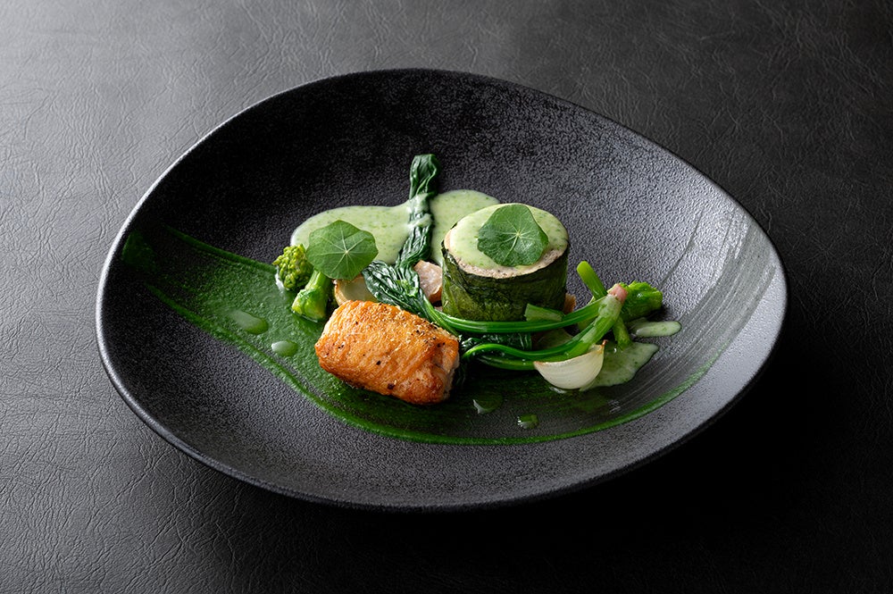 □前菜(温) 奥美濃古地鶏とポルチーニ茸のムースリーヌ 飛騨法蓮草 羽島蓮根 郡上わさび香る菜花ソース