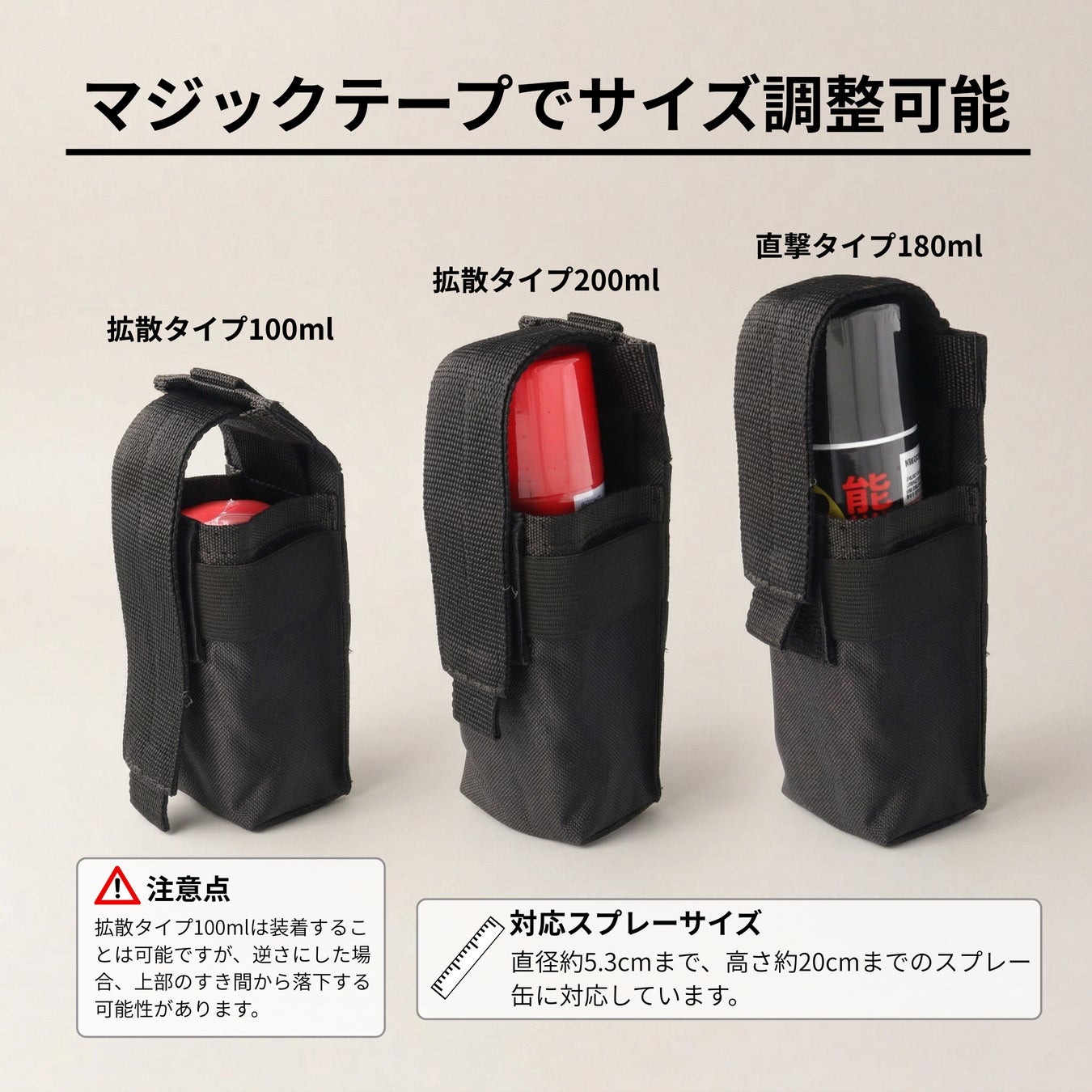 紛失・脱落を防止: マジックテープ式で、歩行中や作業中でもスプレーをホールド。紛失のリスクを低減します。