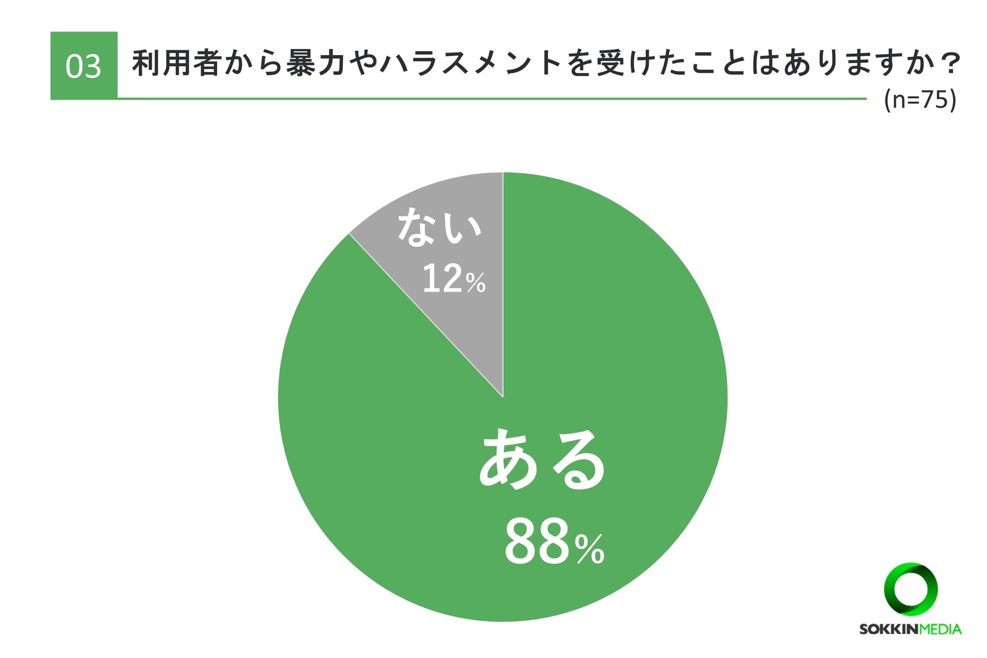「Q3. 利用者から暴力やハラスメントを受けたことはありますか?」という問いに対して、「ある」と答えた方の方が多く88%、「ない」と答えた方は12%という結果になりました。
