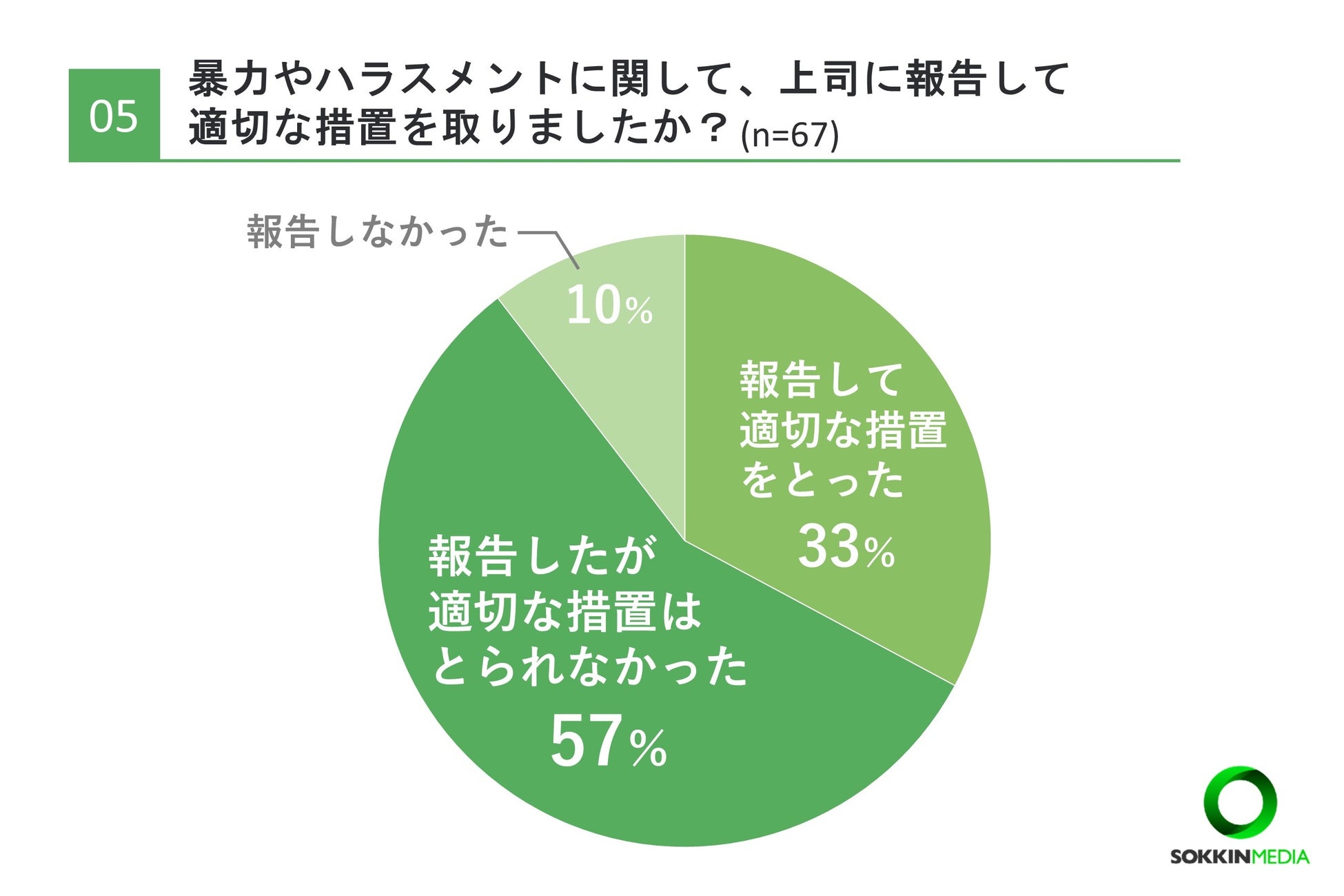 「Q5.暴力やハラスメントに関して、上司に報告して適切な措置をとりましたか?」という問いに対して、「報告したが適切な措置はとられなかった」という回答が最も多く57%、次いで「報告して適切な措置をとった」という回答が33%という結果になりました。