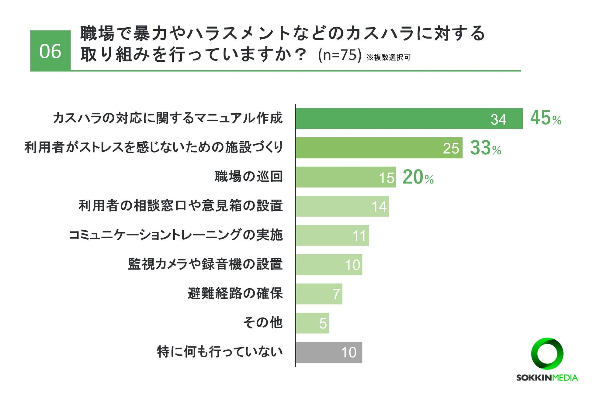 一方で、「特に何も行っていない」という回答も10票と比較的多く、いまだカスハラに対する対策がとられていない職場も多く存在するということがわかりました。