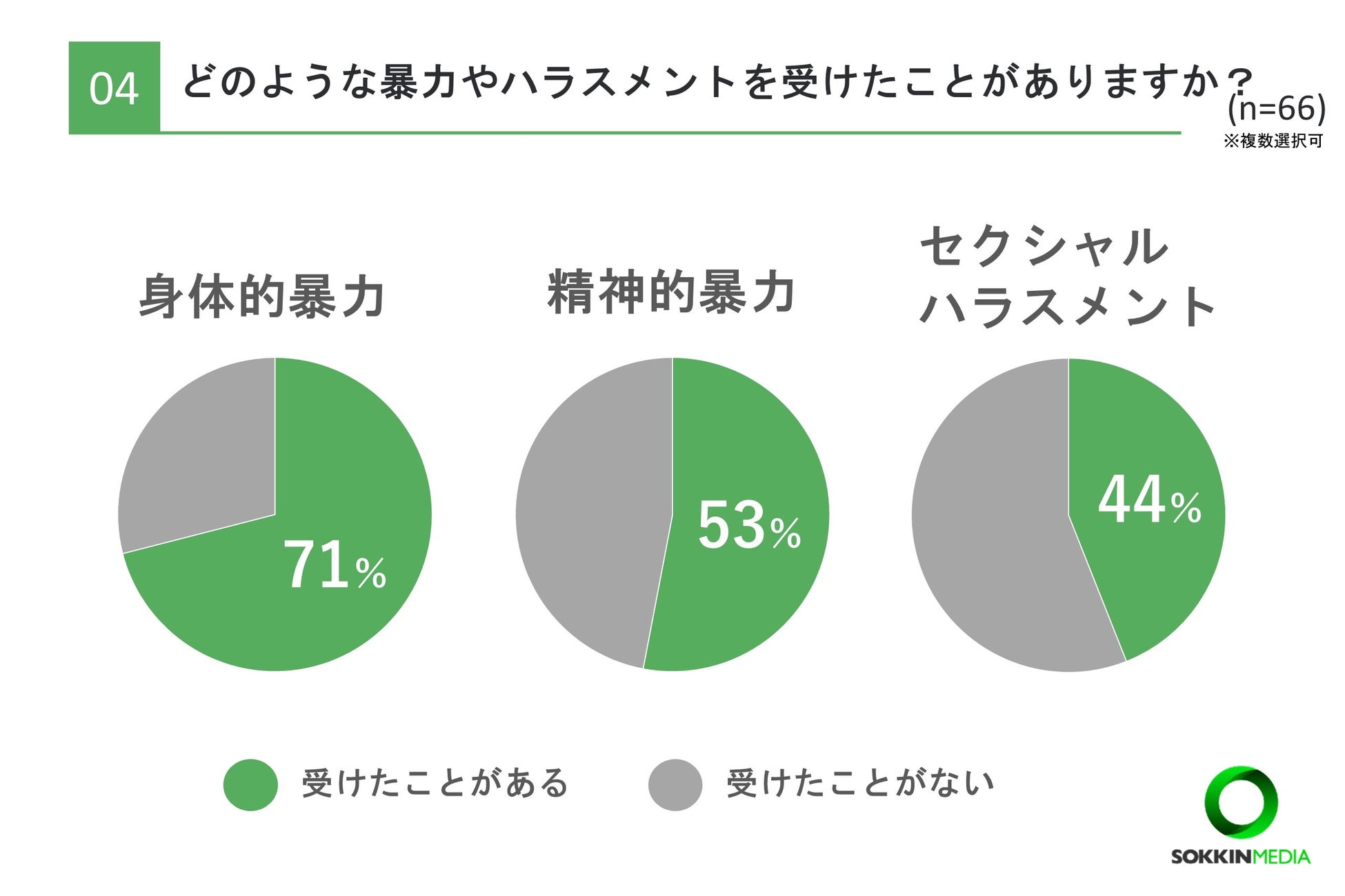 「Q4.どのような暴力やハラスメントを受けたことがありますか? 」という問いに対して「身体的暴力」と回答した方が最も多く全体の71%に上りました。次いで「精神的暴力」と回答した方が53%、「セクシャルハラスメント」と回答した方が44%という結果になりました。