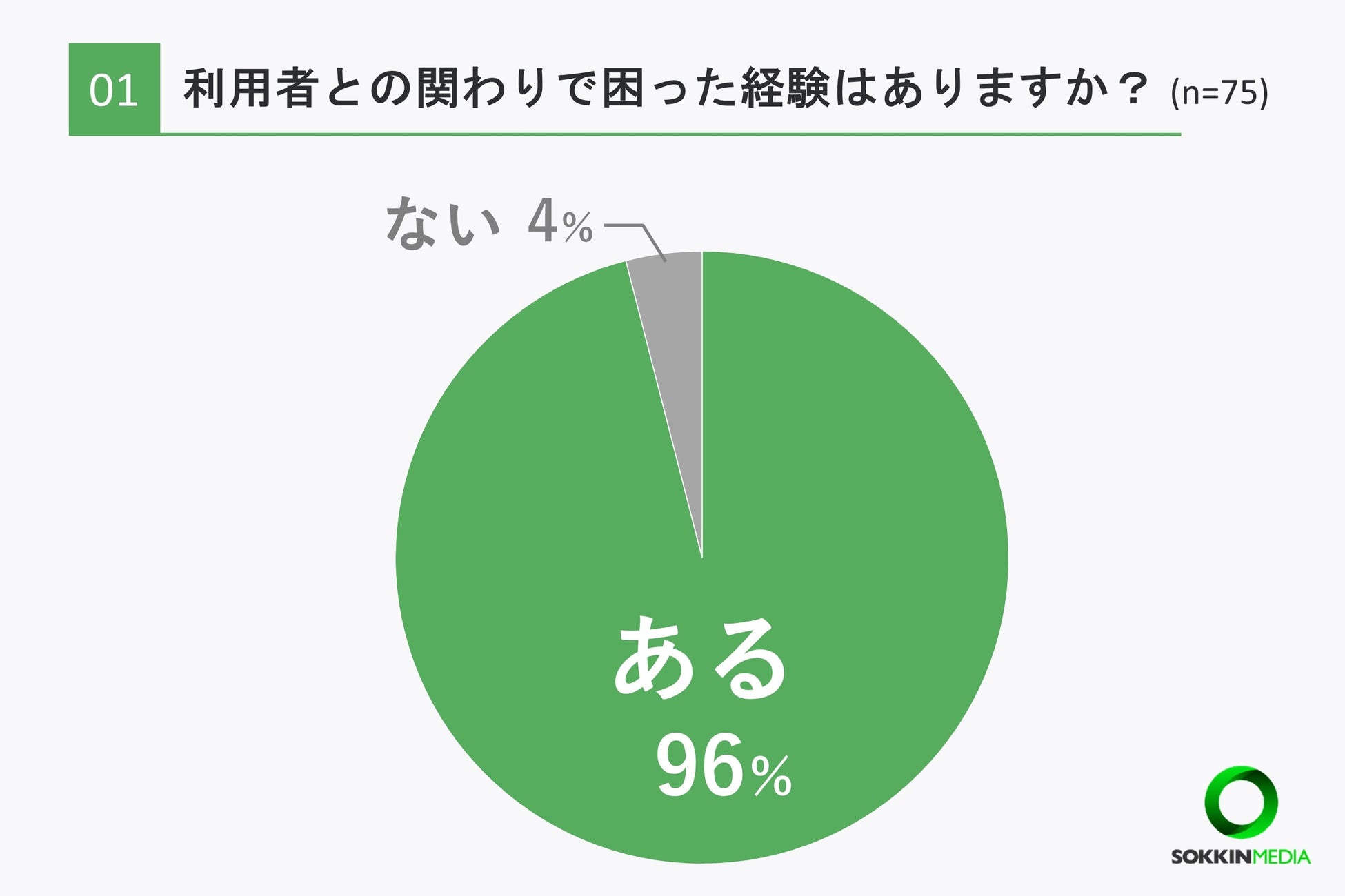 「Q1.利用者との関わりで困った経験はありますか?」という問いに対して、「ある」と答えた方が75人中72人の96%という結果となり、ほとんどの方が利用者との関わりで何かしら困った経験があるということがわかりました。