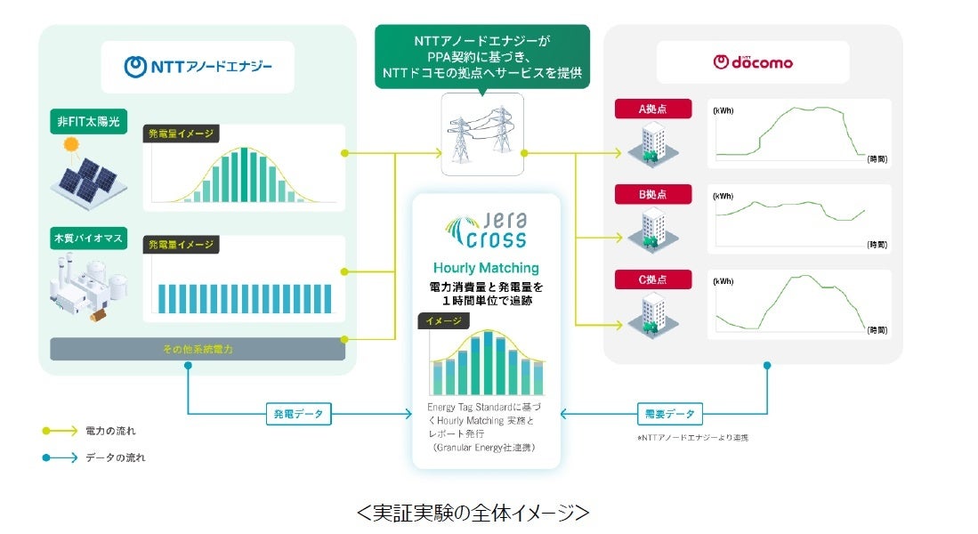 NTTアノードエナジー株式会社(以下、NTTアノードエナジー)、株式会社JERA Cross(以下、JERA Cross)ならびに株式会社NTTドコモ(以下、ドコモ)は、2024年12月から2025年9月の期間で、ドコモの通信ビルへの24/7カーボンフリー電力※1供給に向けて、電力需給におけるHourly Matching※2の実証実験を行いました。