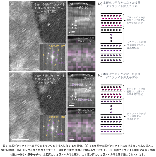 低加速電圧STEMによる観察結果から、グラファイトの表面層は2層アルカリ金属を収容できるように柔軟に拡張し、グラファイト層の深い内部では層間隔の拡張が制限されるため、セシウムのような層間アルカリ金属は1層構造しかとれないと推測されます(図3c)。