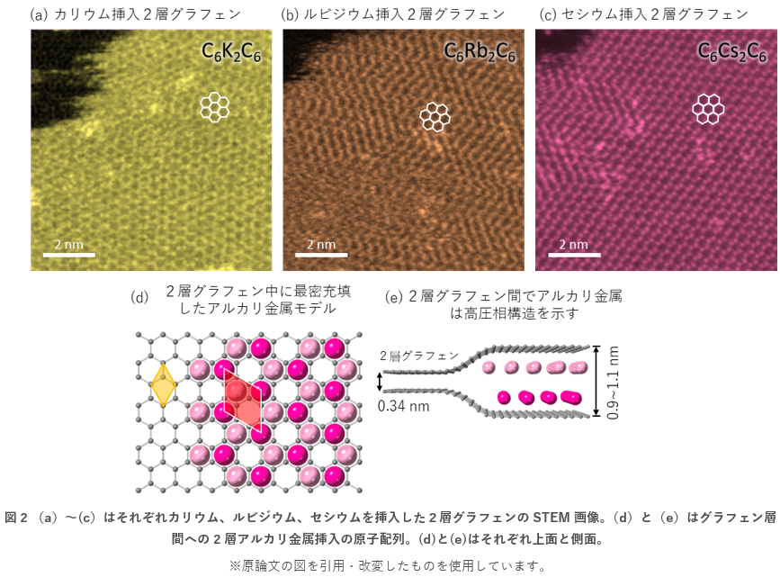 カリウム(K)、ルビジウム(Rb)、セシウム(Cs)をそれぞれ挿入した2層グラフェンの原子配列は、C6M2C6(M = K, Rb, Cs)の化学組成を示しています(図2a-c)。これは、黒鉛層間化合物モデルに基づく期待値よりも、炭素原子当たりのアルカリ金属の密度が2倍になった構造に相当します。密度汎関数理論の計算では、倍の密度のアルカリ金属がエネルギー的に安定するには2層に分離しているべきと見出されました。アルカリ金属が1層で密に充填された場合、アルカリ金属同士が反発するため電磁気エネルギー的に不安定です。しかし、図2dとeに示したように、金属原子の密度が2倍で重ならずに2層に分離した場合、エネルギー的に安定します。