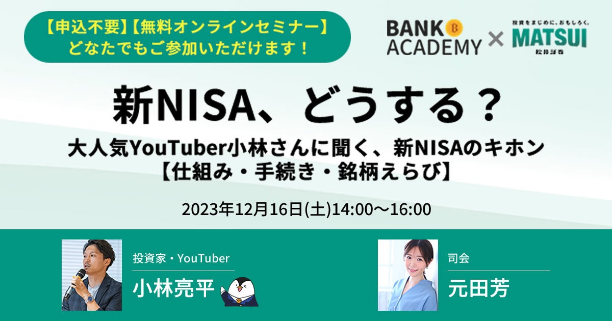 松井証券(以下「当社」)は、新NISAスタート直前企画として、無料オンラインセミナーを2023年12月16(土)に開催いたします。登録者数63万人超の人気YouTuber小林亮平氏をお招きして、2024年1月から始まる新NISA制度について徹底解説いただきます。