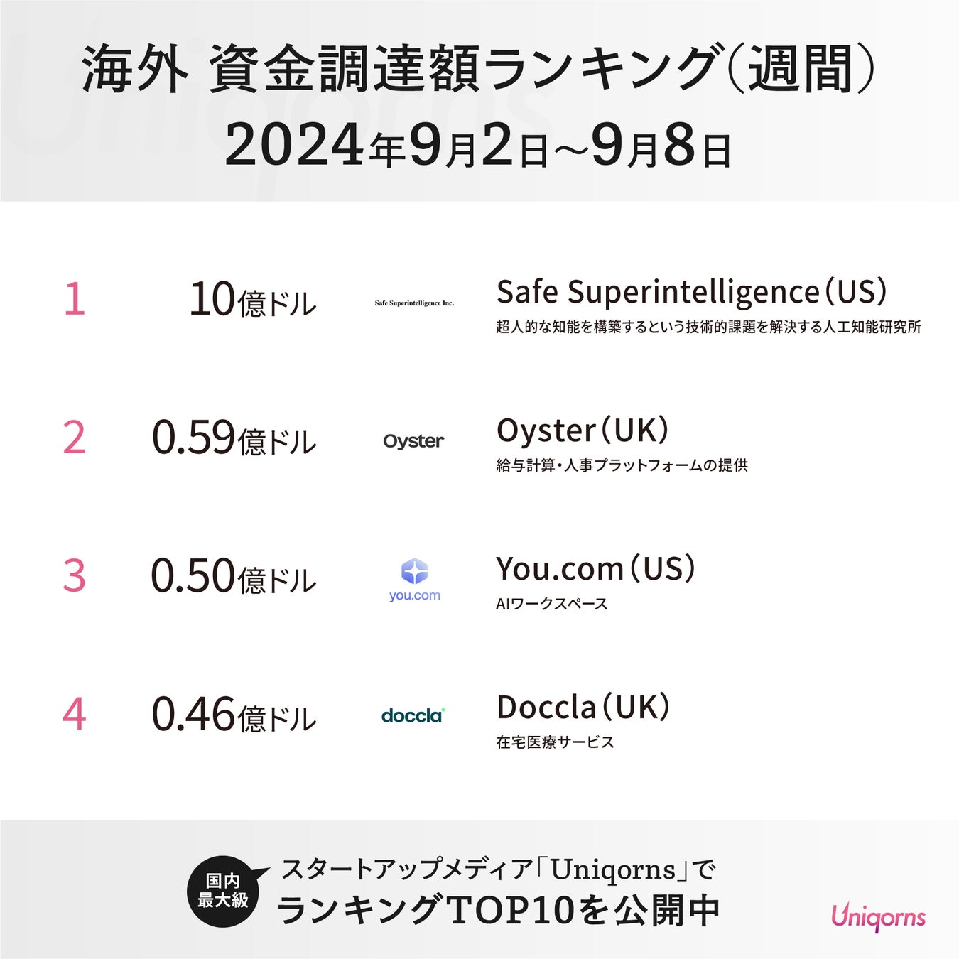 世界中のスタートアップ企業の動向に注目が集まる中、国内最大級のスタートアップメディア「Uniqorns(ユニコーンズ)」が、2024年9月2日〜9月8日の海外スタートアップ資金調達状況をランキング形式で発表しました。今回のランキングでトップに立ったのは、アメリカの人工知能研究所「Safe Superintelligence」です。同社は超人的な知能の構築という技術的課題に取り組んでおり、NFDG、a16z、セコイアなど著名な投資家から10億ドル(約1,500億円)という巨額の資金を調達しました。ランキングには他にも、イギリスの給与計算・人事プラットフォーム「Oyster」や、アメリカのAIワークスペース「You.com」など、革新的な技術やサービスを提供する企業が名を連ねています。