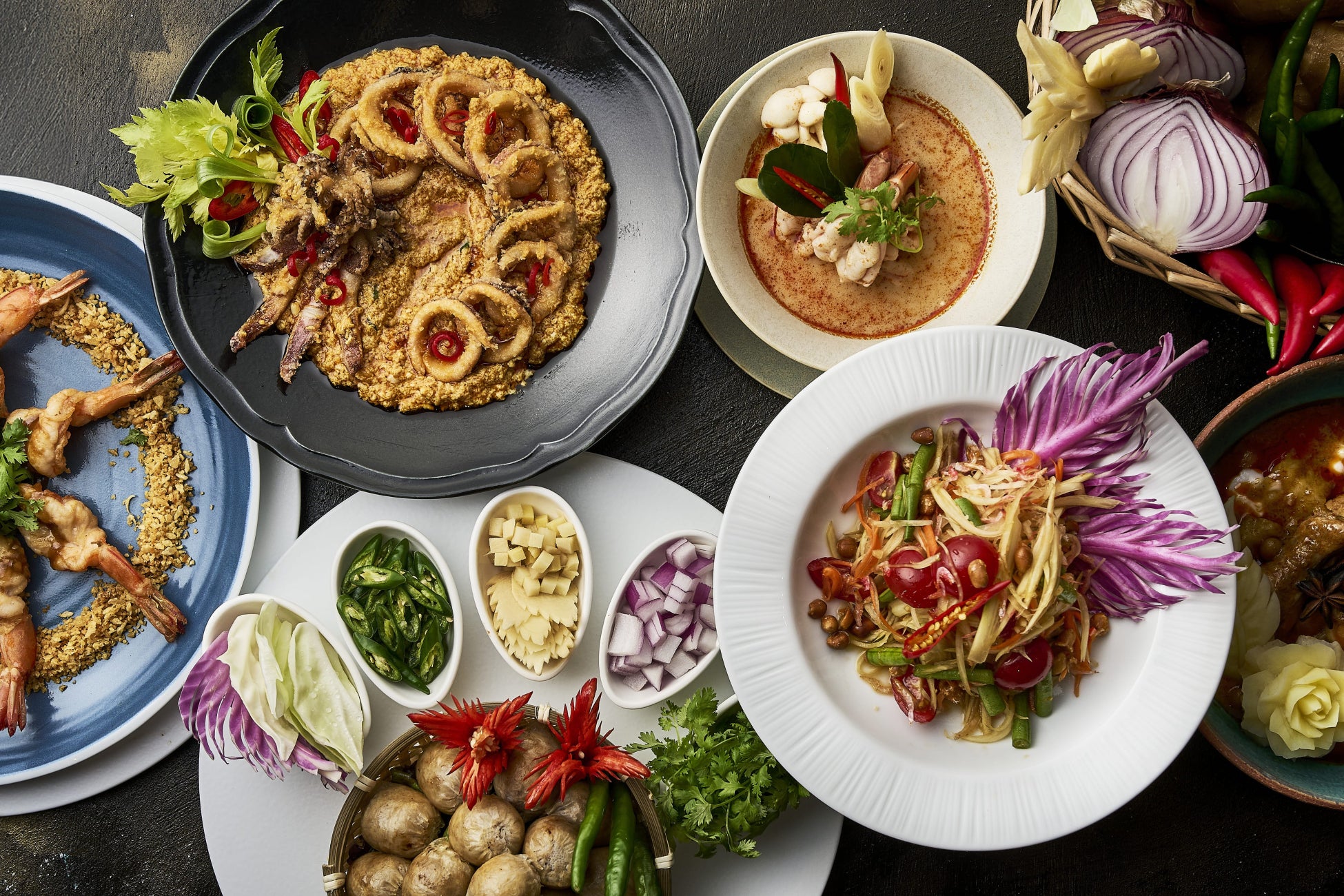 タイ東北部にあるイサーン地方が発祥のソーセージ「サイクローク・イサーン」は、外はカリッ、中はジューシーな豚肉の旨味と春雨の食感が虜になる味わいです。数種類のスパイスをブレンドし、牛乳と卵でマイルドに仕上げる「イカのカレー炒め」や、ぷりぷりの海老に揚げたにんにくをかけ、シンプルながらもクセになる「ガーリック&ブラックペッパーシュリンプ」は出来立てをライブクッキングでご提供します。他にも、「青パパイヤのサラダ」や「トムヤムスープ」など、定番のタイ料理もお楽しみください。