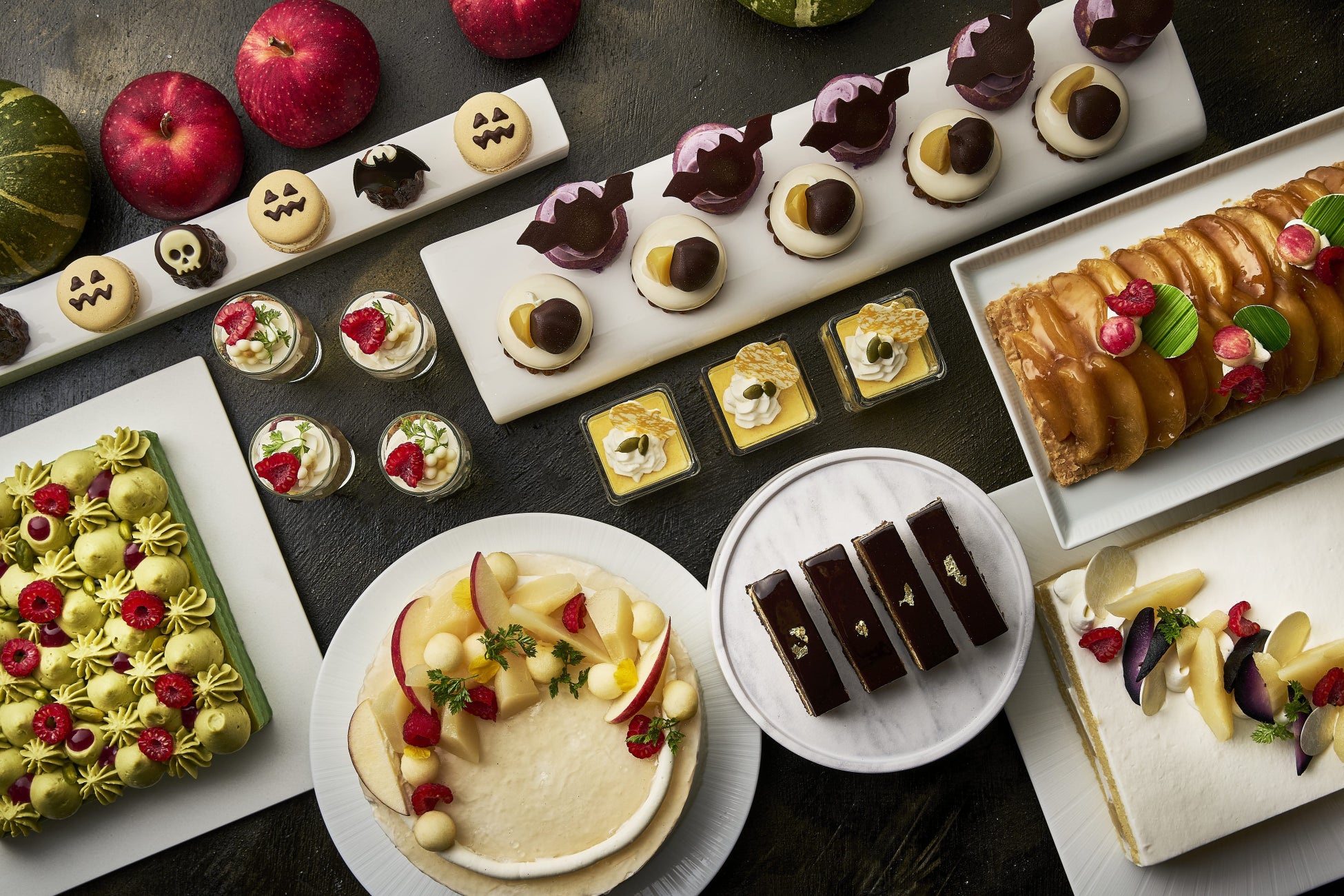ランチメニューだけでなく、パティシエ手作りの絶品スイーツもお好きなだけお楽しみいただける本ビュッフェでは、ふわふわのスポンジにクリーミーな生クリーム、上品な甘さの洋梨を合わせた「洋梨のショートケーキ」や、鮮やかなグリーンと真っ赤なラズベリーがまるでアート作品のように美しい「ピスタチオ&ラズベリーケーキ」、口の中いっぱいにジューシーなリンゴと濃厚なキャラメルカスタードクリームが広がり、パイ生地のサクサク感がアクセントの「キャラメルアップルパイ」、リッチな味わいが魅力の「オペラ」が華やかに登場します。ハロウィンがモチーフの飾りチョコをあしらった「オレンジマカロン」、コウモリをトッピングし紫芋のクリーミーな味わいが魅力の「サツマイモシュー」など、見た目にも可愛らしいハロウィンスイーツも必食です。