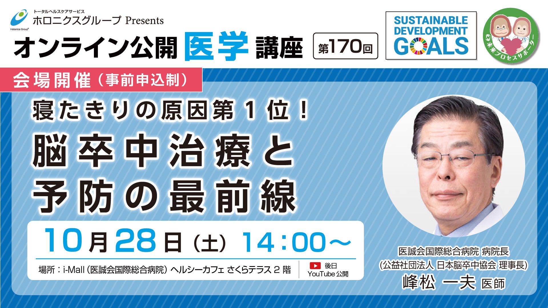 本講座は、開設されたばかりの医誠会国際総合病院にて、「脳卒中の治療と予防の最前線」を分かりやすく解説します。