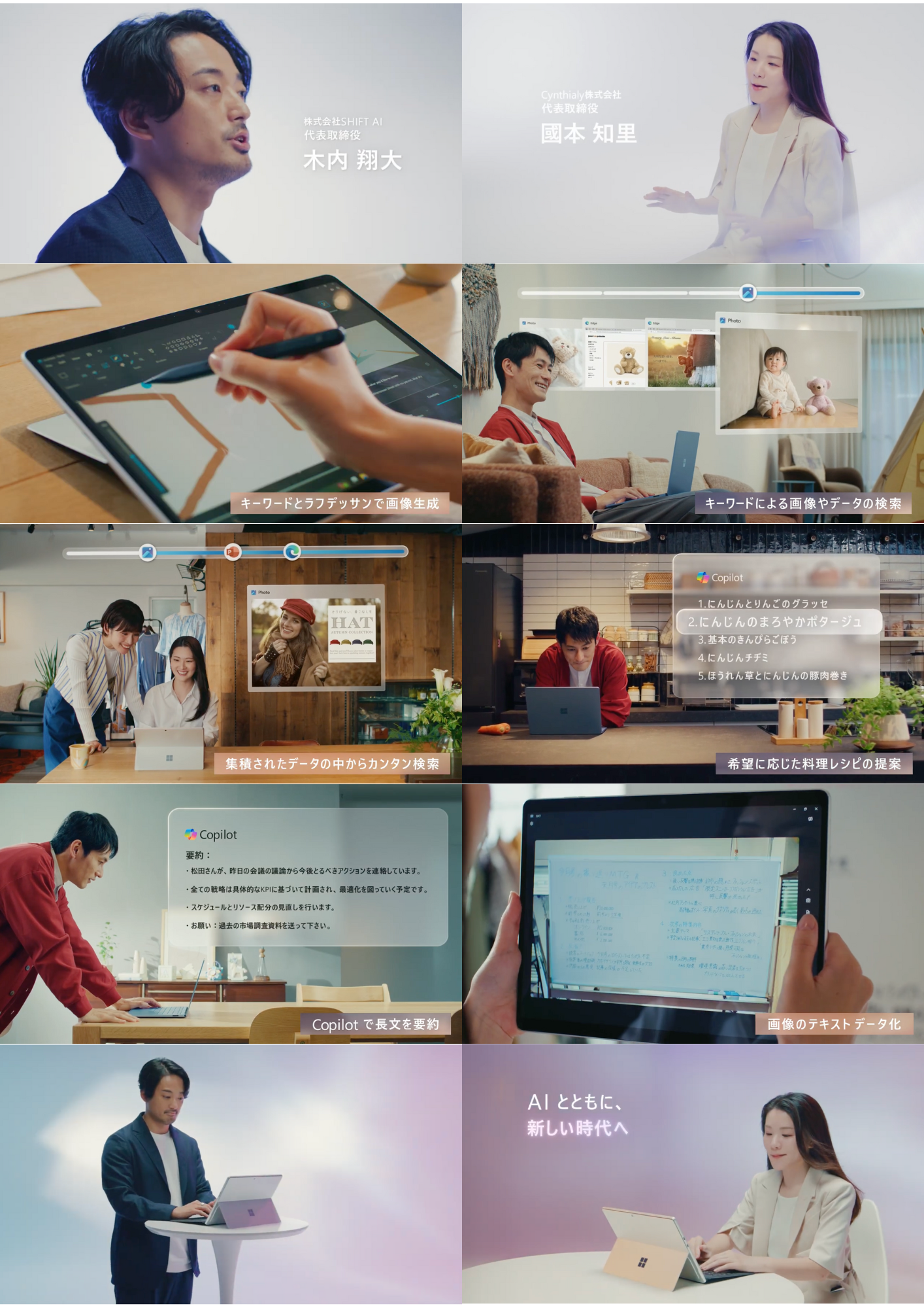 AIの専門家としてSHIFT AI代表の木内とCynthialy 代表の國本が「Copilot+ PC」 CMに出演。