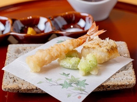 日本料理と天ぷらが味わえるおまかせ。綿実油で揚げる天ぷらは、軽やかな仕上がり。