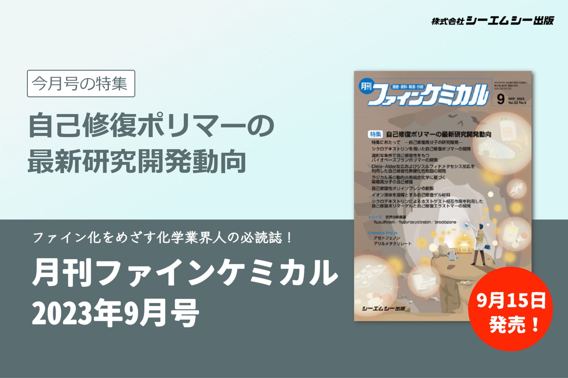 自己修復機能を持ち、持続可能社会実現に向けて注目を浴びる高分子材料、“自己修復ポリマー”の最新研究動向を特集。雑誌『月刊ファインケミカル 2023年9月号』が9月15日に発売。