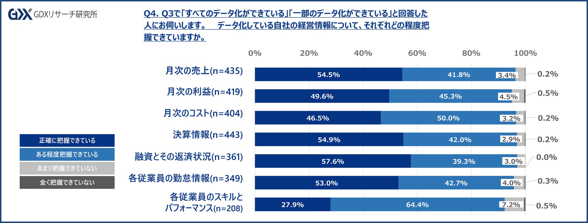 Q4. Q3で「すべてのデータ化ができている」「一部のデータ化ができている」と回答した人にお伺いします。データ化している自社の経営情報について、それぞれどの程度把握できていますか。