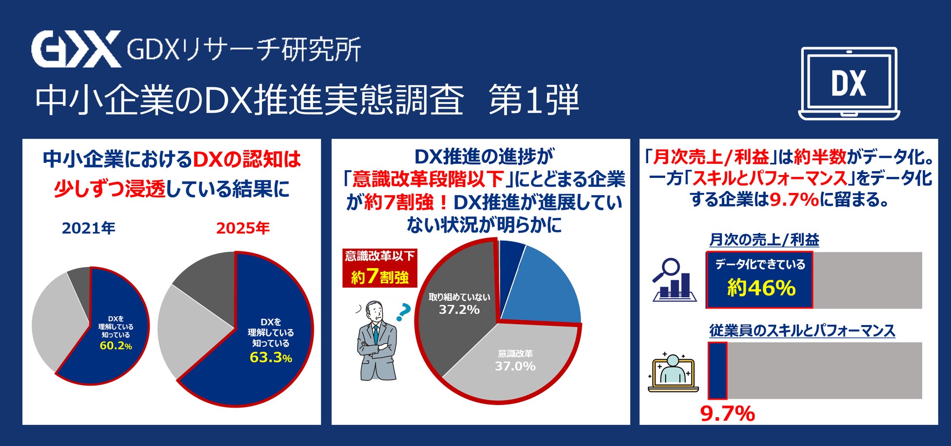 ②企業のDX推進の進捗を見ると、 DX推進の最も進んだ「事業改革段階」に達している企業は全体のわずか5.3%に。 「意識改革段階」以下にとどまる企業が約7割を占め、DX推進が初期段階から進展していない状況が明らかに。