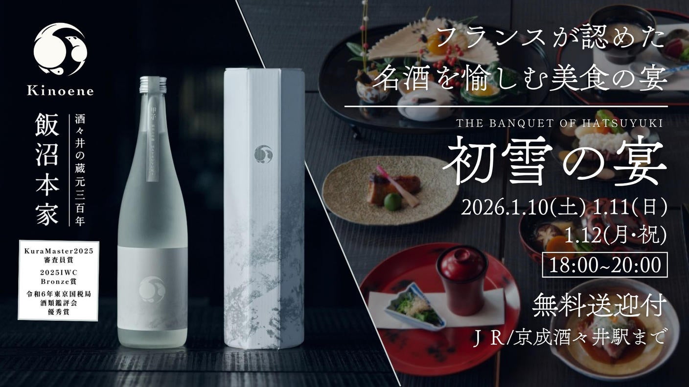 2026年1月10日(土)、11日(日)、12日(月・祝)に「初雪の宴」を初開催。 初雪のような穏やかで洗練された香りと、ふくよかな米の旨味、後味のキレの良さを特徴とする「甲子 純米大吟醸 初雪」を、二十四節気の小寒・大寒に合わせた特別なお食事とともにお愉しみください。