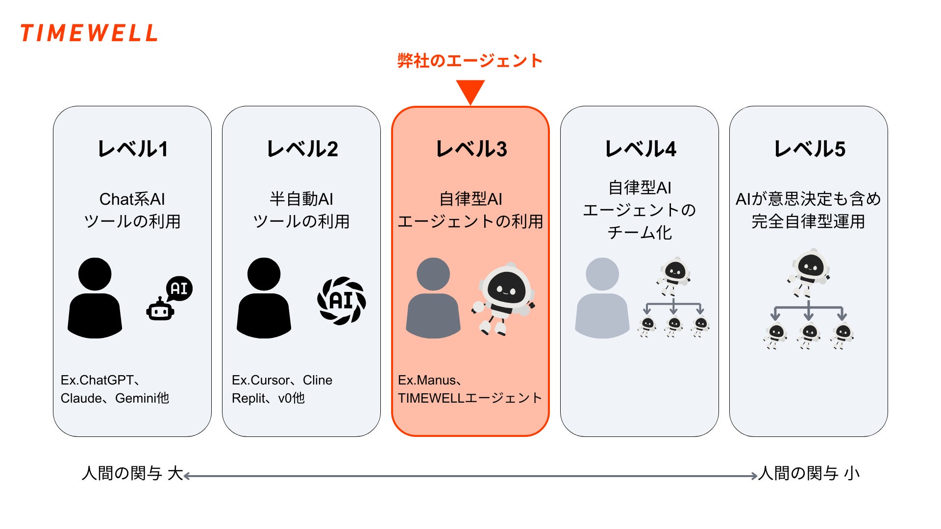 弊社のTIMEWELL AGENTは、自律的に作業を修正しながら実行し、エラーからも復帰できる機能を有し、レベル3相当の機能を有します。また、他のAIエージェントと組み合わせて利用することでレベル4クラスの運用も可能となっています。