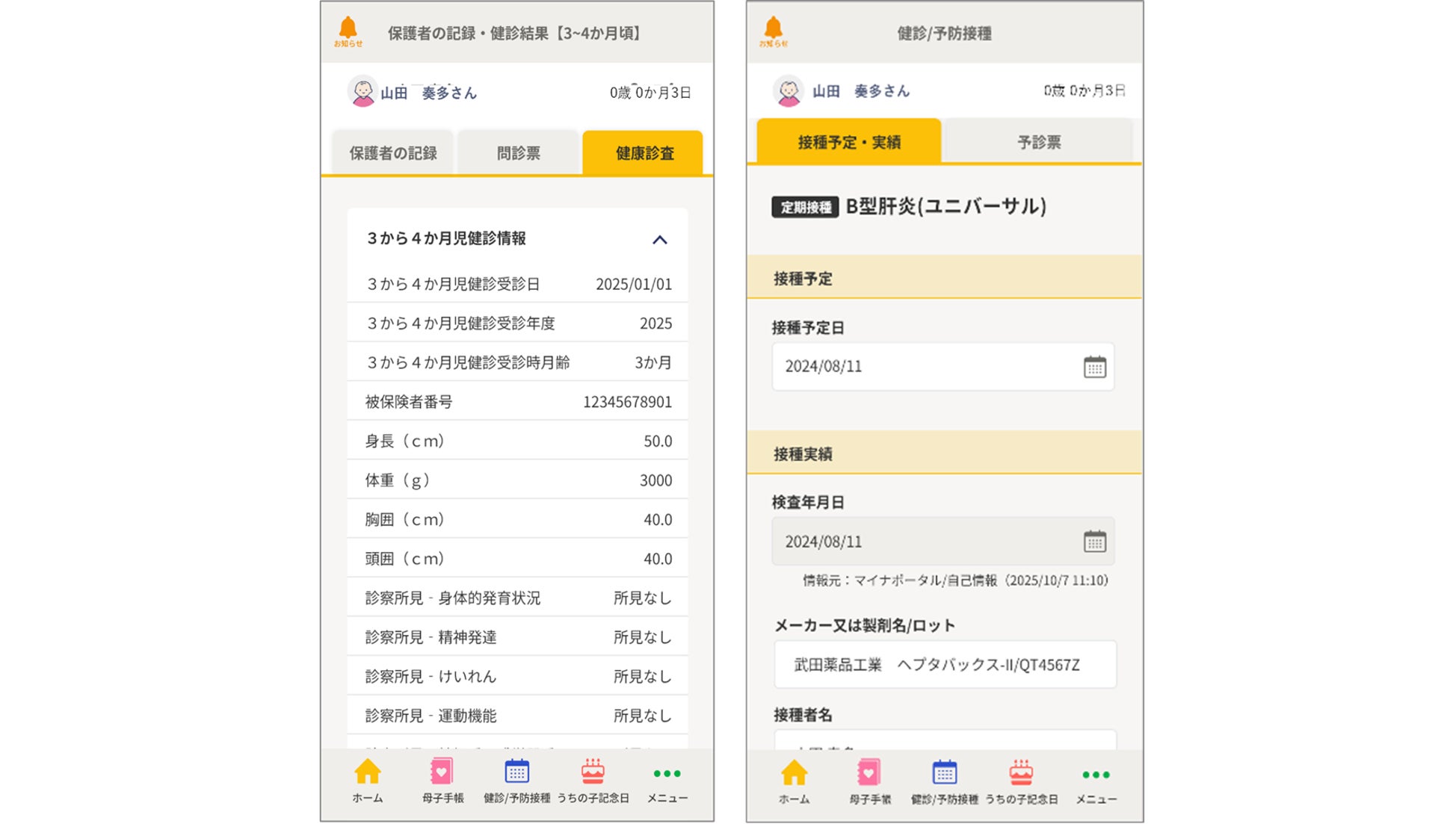 マイナンバーカードを活用しPMHと連携することで、乳幼児健診の結果や予防接種の記録等を、デジタル母子健康手帳に自動で反映します。更に、健診や予防接種のスケジュール管理機能や受け忘れ防止の通知機能等を利用することで、子どもの健康管理をサポートします。