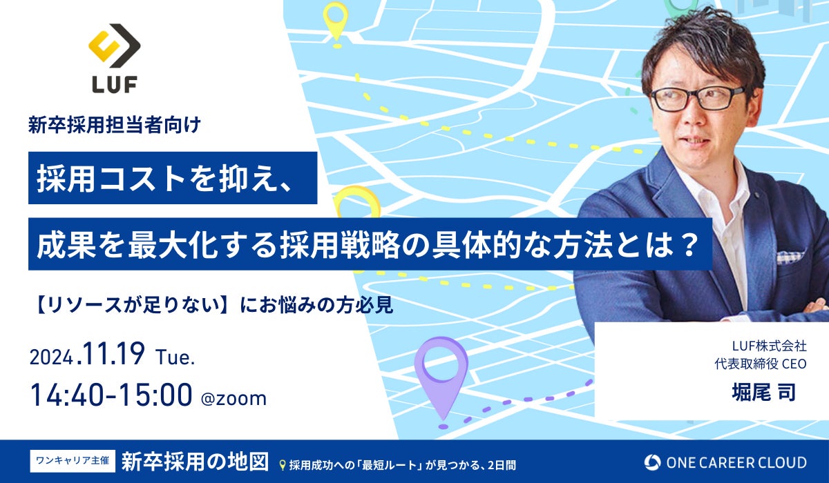 LUF株式会社(本社:東京都港区、代表取締役社長:堀尾 司)は、2024年11月19日(火)に開催されるウェビナー「新卒採用の地図 採用成功への「成功ルート」が見つかる2日間」に登壇いたします。