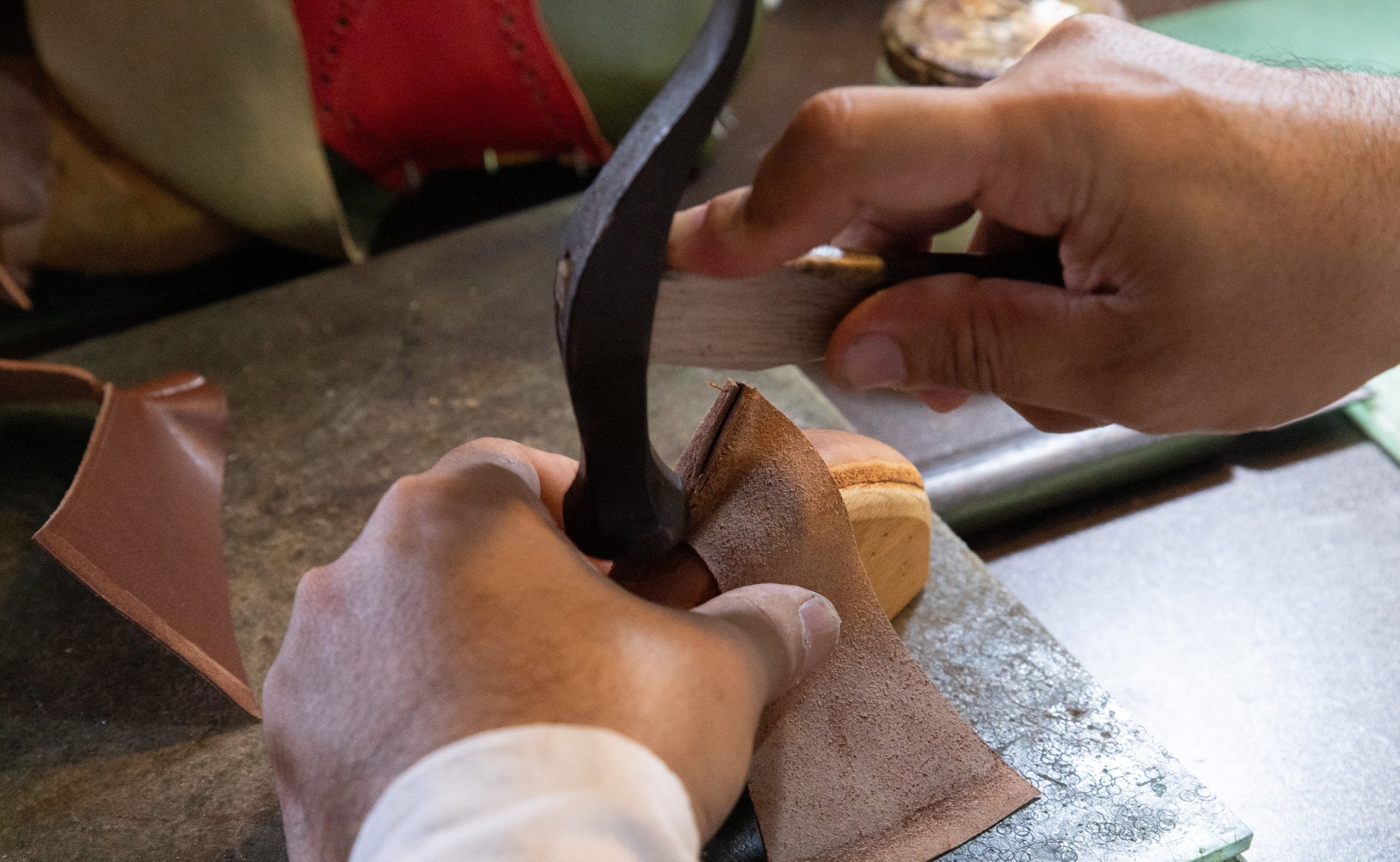 子どものころあこがれたアニメキャラクターの足元を再現したおでこ靴を、工房で一つひとつ手作りしています。