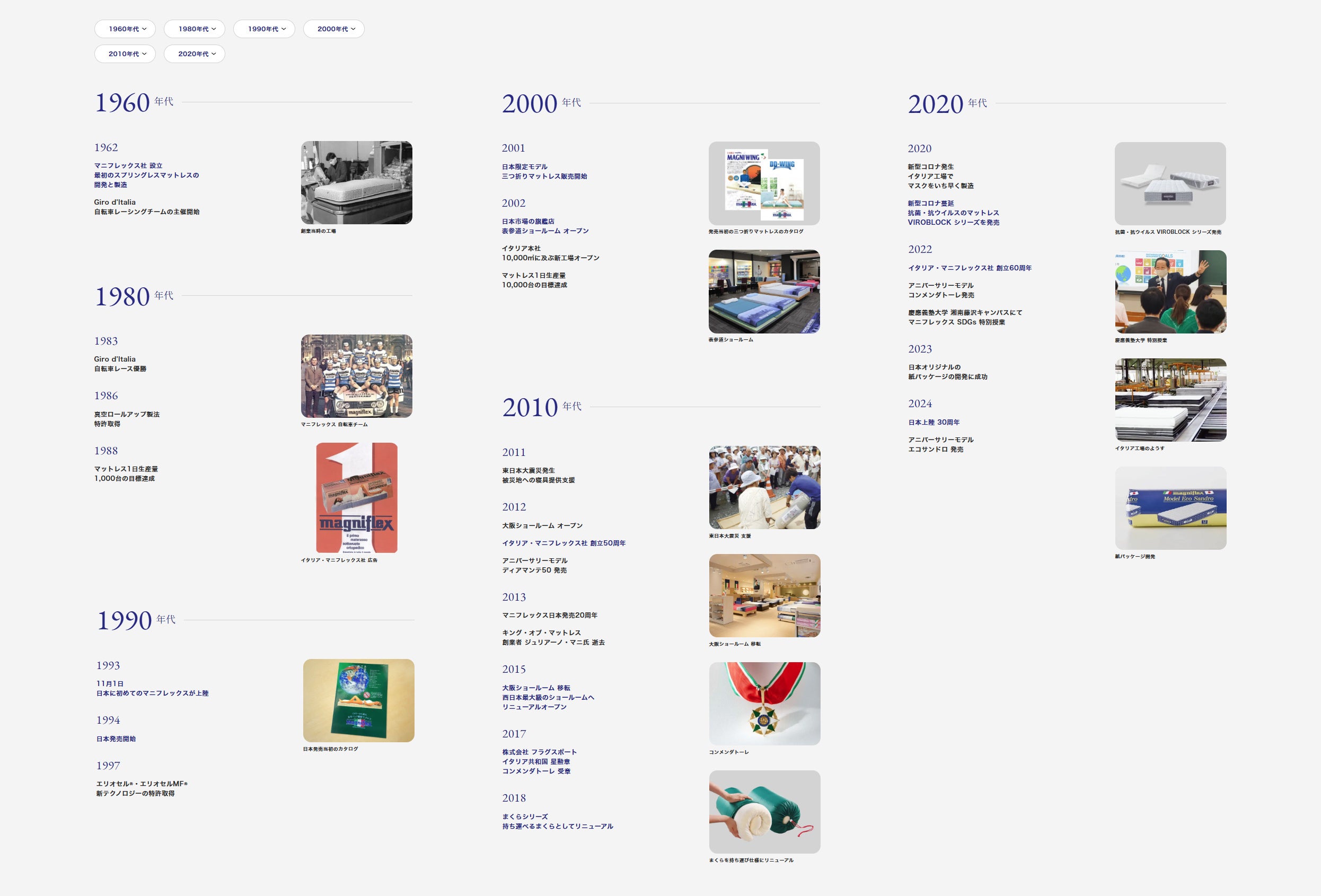 新しいヒストリーコンテンツでは、創業から現在に至るまでの歩みを年代ごとに整理し、写真とともに紹介しています。また、日本市場での展開の歴史についても掲載し、日本上陸から30年以上にわたるマニフレックスの歩みを振り返ることができます。