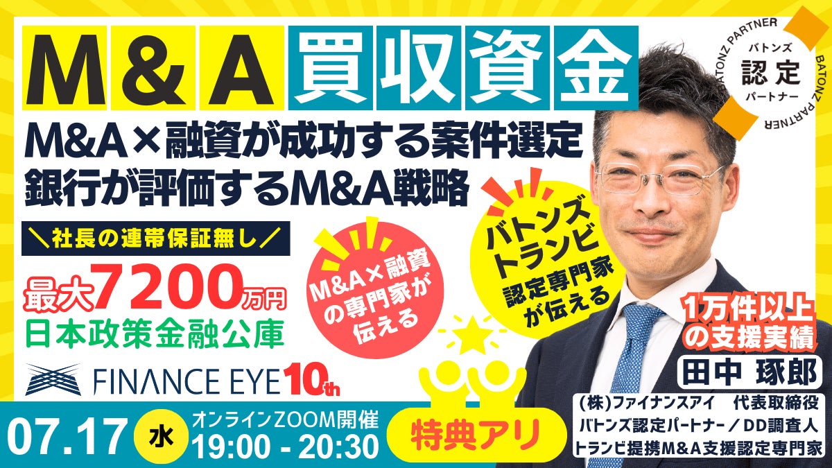 株式会社ファイナンスアイ(所在地:大阪市、代表:田中琢郎)は、M&Aの買手向けに買収資金を増やしたい起業家・個人事業主・中小企業の経営者に向けて特別なセミナーを開催致します。『M&A×融資を成功させるには?M&A×融資が成功する案件選定。銀行が評価するM&A戦略~社長の連帯保証無し!無担保で最大7200万円!日本政策金融公庫の新規開業資金(創業融資)を活用する。』(※参加者の顔出しナシ)と題したこのセミナーでは、日本国内M&A成約数1位のBATONZ(バトンズ)認定パートナー/認定アドバイザー/認定DD調査人、国内最大級のM&AサイトTRANBI(トランビ)提携のM&A支援の認定専門家である田中琢郎社長自らが、1万人以上の起業家や経営者を支援した実戦経験をもとに、M&A起業やM&A買収資金にも使える、新規開業資金(創業融資)を成功させるポイントやM&A×融資を成功させるための案件選定基準を分かりやすくお伝えします。本セミナーは、2024年7月17日(水)19:00より、オンラインZOOMで開催します。コロナ禍を乗り越え、億超えの起業家を生み出し続けたファイナンスアイが、良い案件も悪い案件も1万人以上をリアルに支援したから分かる融資審査の本音と建前、M&Aのオカネとリスクの解決策を分かりやすく伝えます。セミナーでは田中社長とライブで質疑応答ができるので厳格化する融資審査を乗り越えるために具体的なアドバイスが欲しい人はチャンスです。セミナー申込時の受付フォームで事前質問に記入してもらえれば、セミナー中に回答できそうにない内容でも別途具体的なアドバイスを受けられます。この機会に誰にも相談できなかった悩みや疑問を解決しましょう。