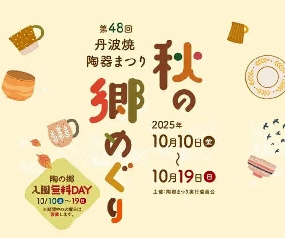 丹波焼陶器まつり実行委員会(丹波篠山市・丹波立杭陶磁器協同組合ほか)は、2025年10月10日(金)から10月19日(日)まで、「第48回丹波焼陶器まつり 秋の郷めぐり」を開催します。