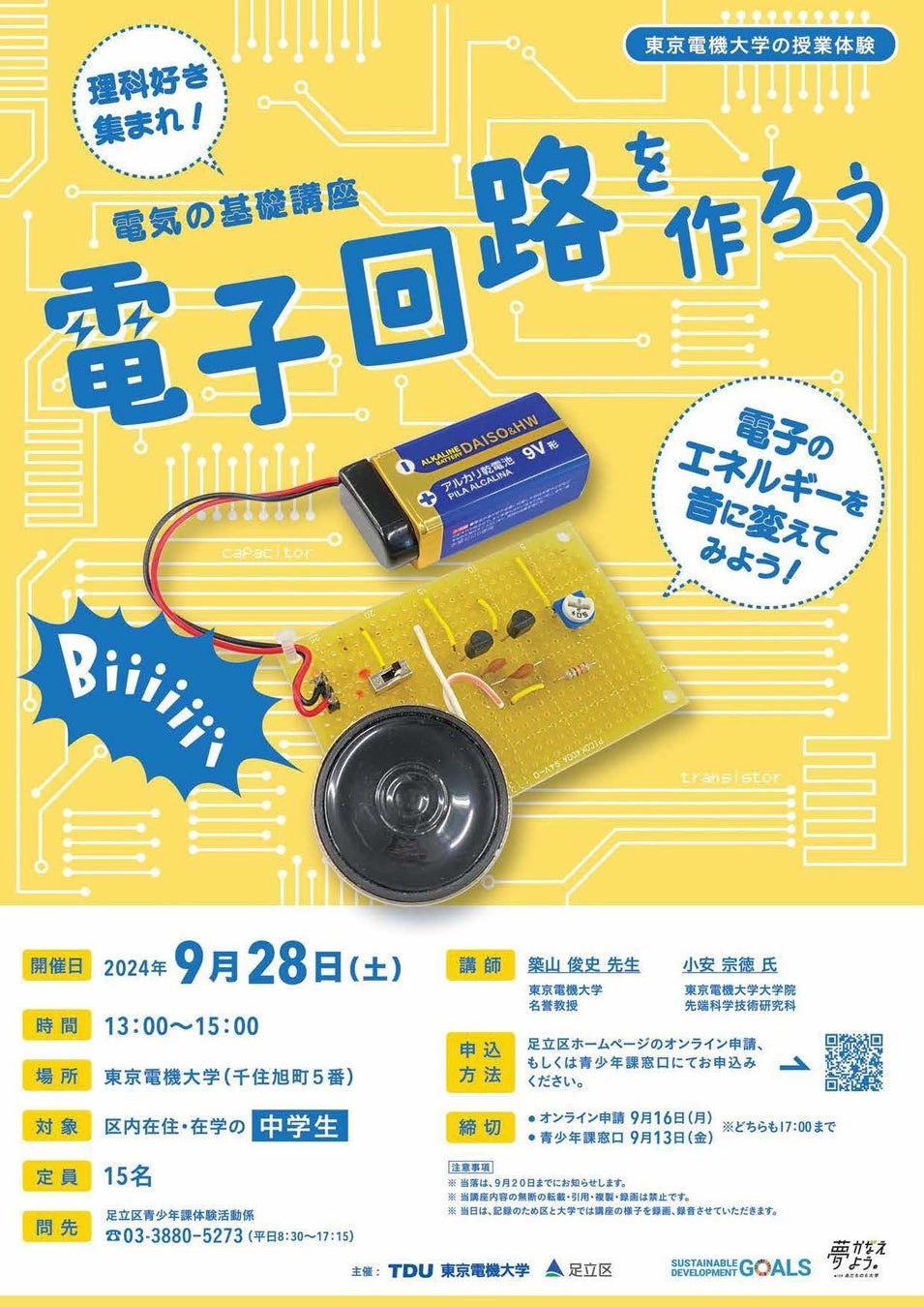 【東京電機大学×足立区】中学生向け体験型ワークショップ「理科好き集まれ! 電気の基礎講座 電子回路を作ろう」を開催