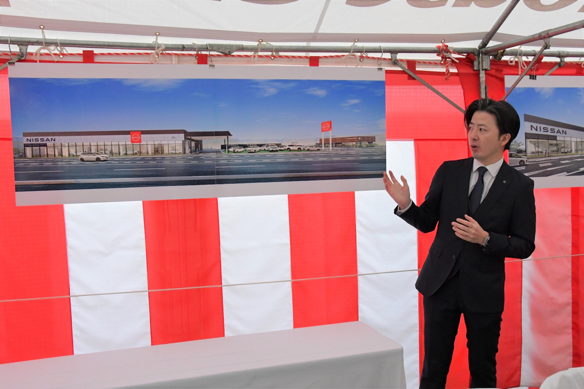 福島日産 金子社長は、地鎮祭の会場で「お客様をはじめ、地域の方にとって楽しんでいただける環境を作りたい。福島日産としては初めてのブランドエクスペリエンスストアの導入となるので、たくさんの方に来ていただきたい」と関係者に向けた挨拶を行いました。