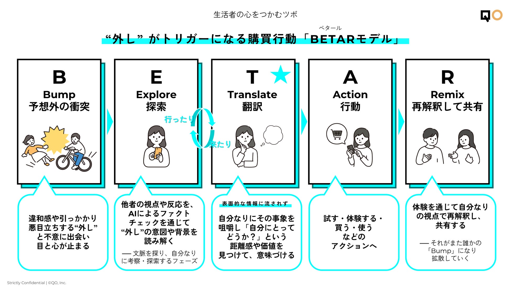 この「BETAR(ベタール)モデル」は、「外し」がトリガーになる購買行動モデルです。「外し」との出会いを入口とし、その後の態度変容までどのようなプロセスを経ているのか、QOプランナーの仮説をもとに形にしました。