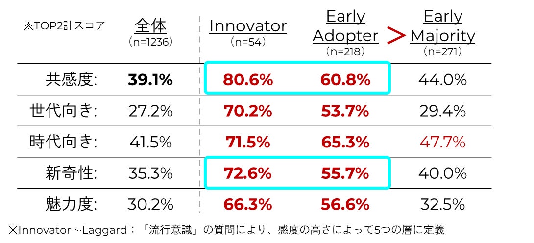 今回の見立てについて、QOが実施した検証調査*⁶では、イノベーター理論のタイプ別に共感度の差が出ており、イノベーター層では80.6%、アーリーアダプター層では60.8%と、先進的な層を中心に比較的高い共感度を得ていることがわかりました(図1)。