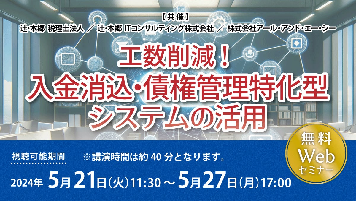 辻・本郷 税理士法人(本社:東京都新宿区、理事長:徳田孝司)は、辻・本郷 ITコンサルティング株式会社(本社:東京都渋谷区、代表取締役社長:黒仁田健)と株式会社アール・アンド・エー・シー(本社:東京都中央区、代表取締役社長:太刀川秀臣)の3社共催で、「工数削減! 入金消込・債権管理特化型システムの活用」セミナーを開催いたします。法対応で経理実務担当者の負担が多くなっている昨今、経理業務の業務効率化は重要です。中でも、入金消込・債権管理は実務担当者が多く時間をかけており、業務を自動化することで時間を短縮し工数を削減することが可能です。本セミナーでは、入金消込・債権管理のポイントと、それに特化したクラウドシステムとして、「V-ONEクラウド」をご紹介します。基幹・会計システムに手入力している、複数請求や一括入金などの照合に時間がかかっている、手作業や目視に工数がかかっている企業様向けのセミナーです。