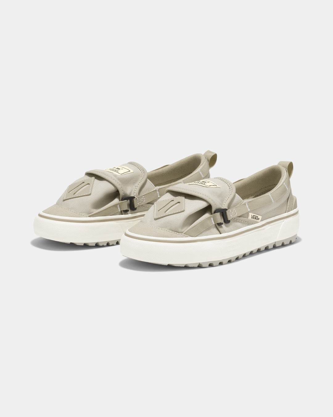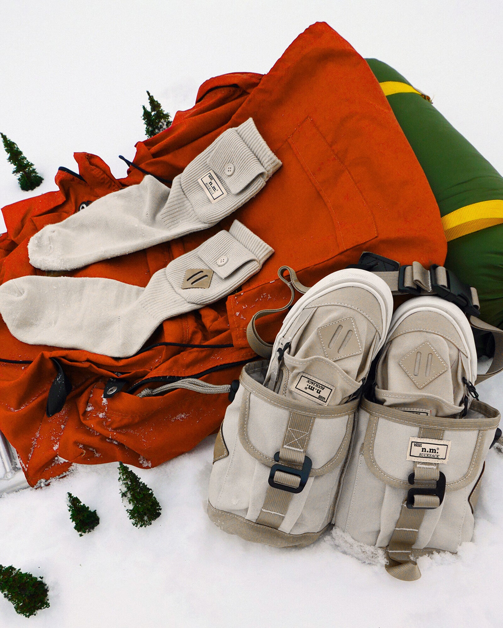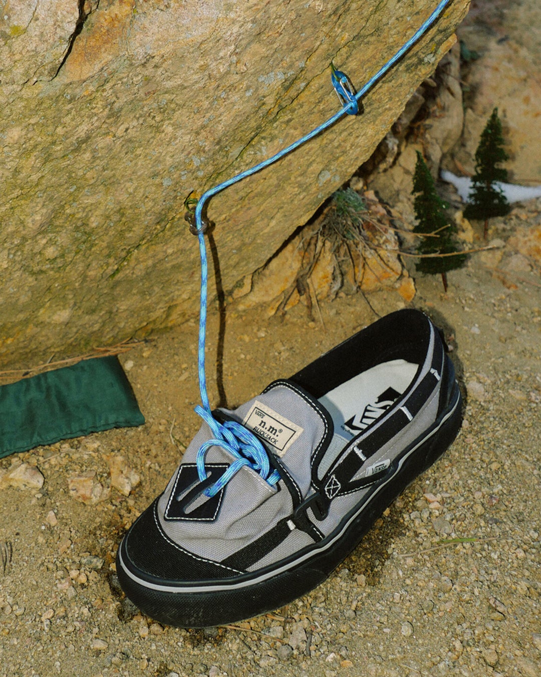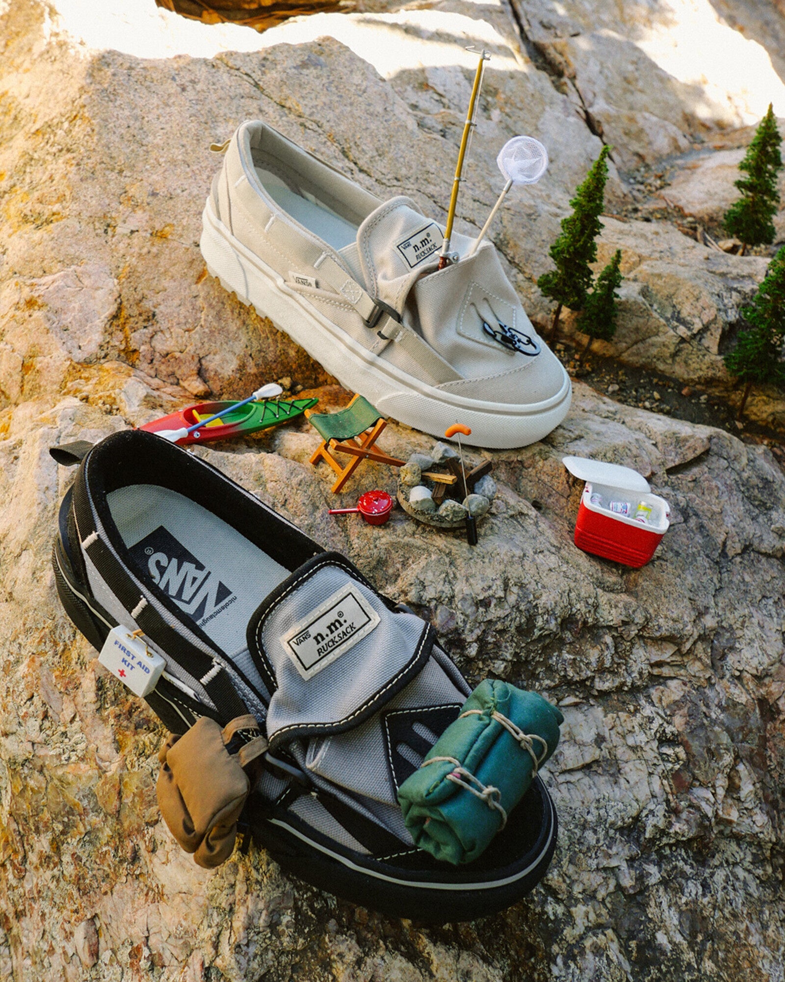 本コレクションの目玉として、VANSの定番モデルSLIP-ON (スリッポン) をベースに、70年代のヴィンテージハイキング用バックパックからインスピレーションを得た「Slip-On RS」が登場。