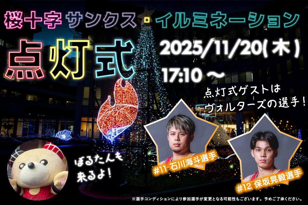 点灯式当日には、熊本ヴォルターズの石川海斗選手・保坂晃毅選手、そしてマスコットキャラクターのぼるたんがゲストとして登場します。選手によるカウントダウンの合図とともに、会場全体に一斉に光が灯る瞬間は圧巻。歓声と拍手に包まれながら、冬の夜に温かな輝きが広がります。式典の後には、選手と一緒に撮影できる写真撮影会も実施予定(事前申込制・先着30組)。直接選手とふれあえる貴重な機会として、毎年多くの方が楽しみにしている人気企画です。また、院内の「VOLCAFE(ヴォルカフェ)」では、ヴォルターズチアリーダーVGクリスマスコラボオリジナルコースターやドリンクなど、期間限定、ここでしか味わえない“クリスマスの特別体験”をご用意しています。