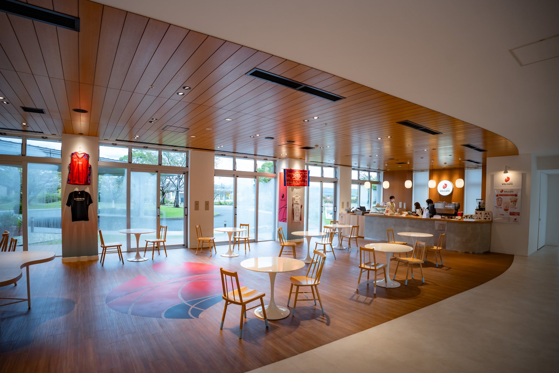 桜十字病院内に2024年9月にオープンした、熊本ヴォルターズとのコラボカフェです。ロゴをあしらった内観で、魅力たっぷりの店内。期間限定で配布している選手のコースターやオリジナルドリンクが大人気で、院内外の方にお楽しみいただけております。