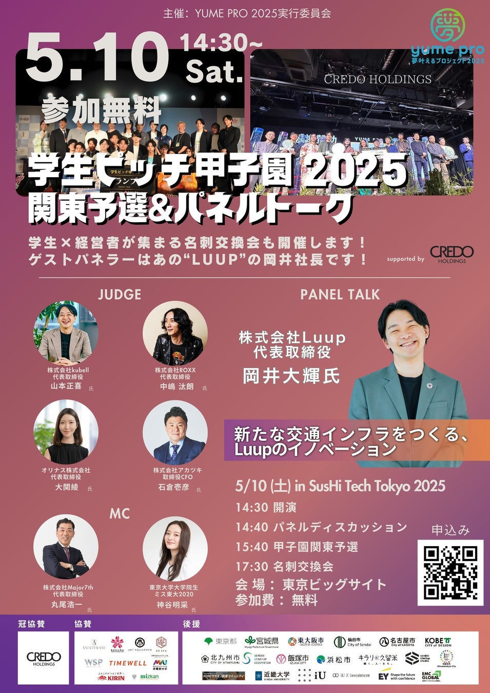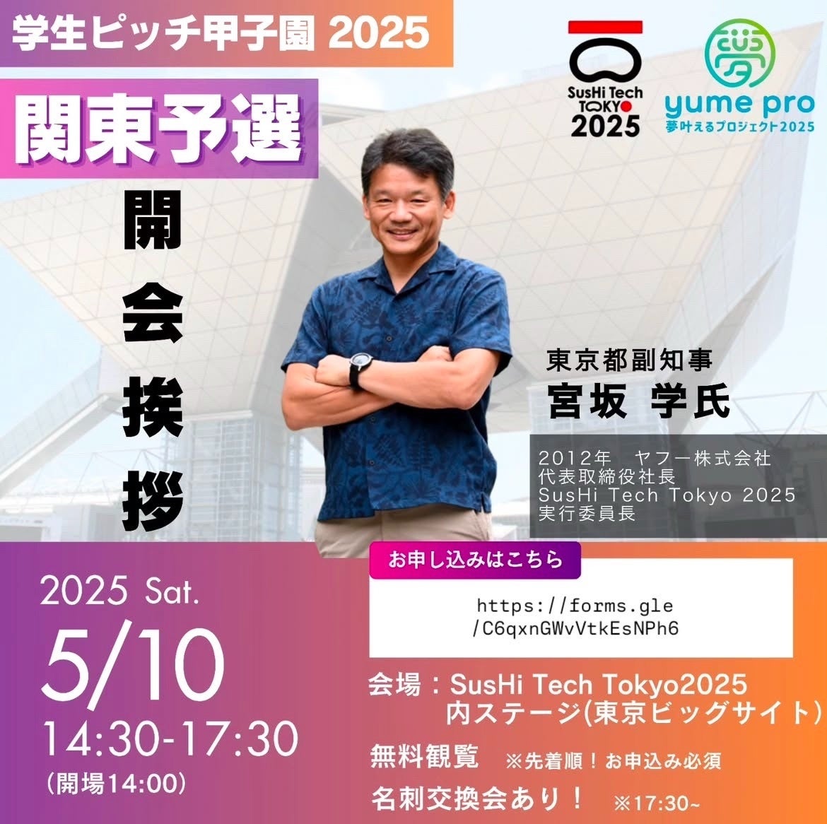 2025年5月10日(土)14:30より「学生ピッチ甲子園2025 関東予選&パネルトーク」が、東京ビッグサイト「SusHi Tech Tokyo 2025ステージ」にて開催されます。本イベントは「YUME PRO 2025実行委員会」主催のもと、未来の起業家を応援するピッチ大会として毎年注目を集めています。