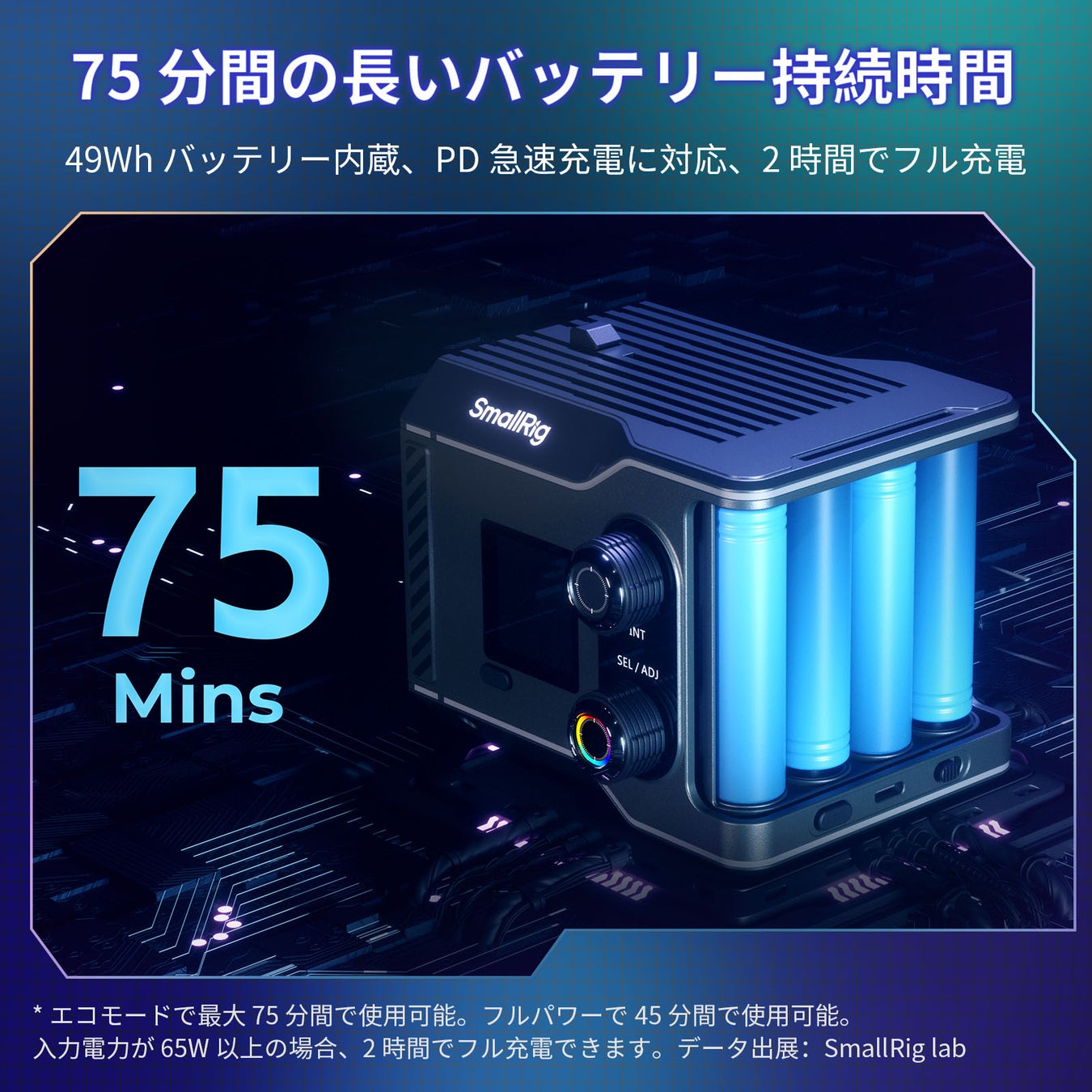 RC 60C は、49Whの内蔵バッテリーにより75分間の長い持続時間に対応できます。エコモードでは最大75分間の使用が可能です。フルパワーで45分間の使用が可能です。また、PD急速充電に対応し、入力電力が65W以上の場合、2時間でフル充電できます。モバイルバッテリーやバッテリーハンドルなどでの給電方式にも対応可能で、バッテリー切れの不安を軽減します。