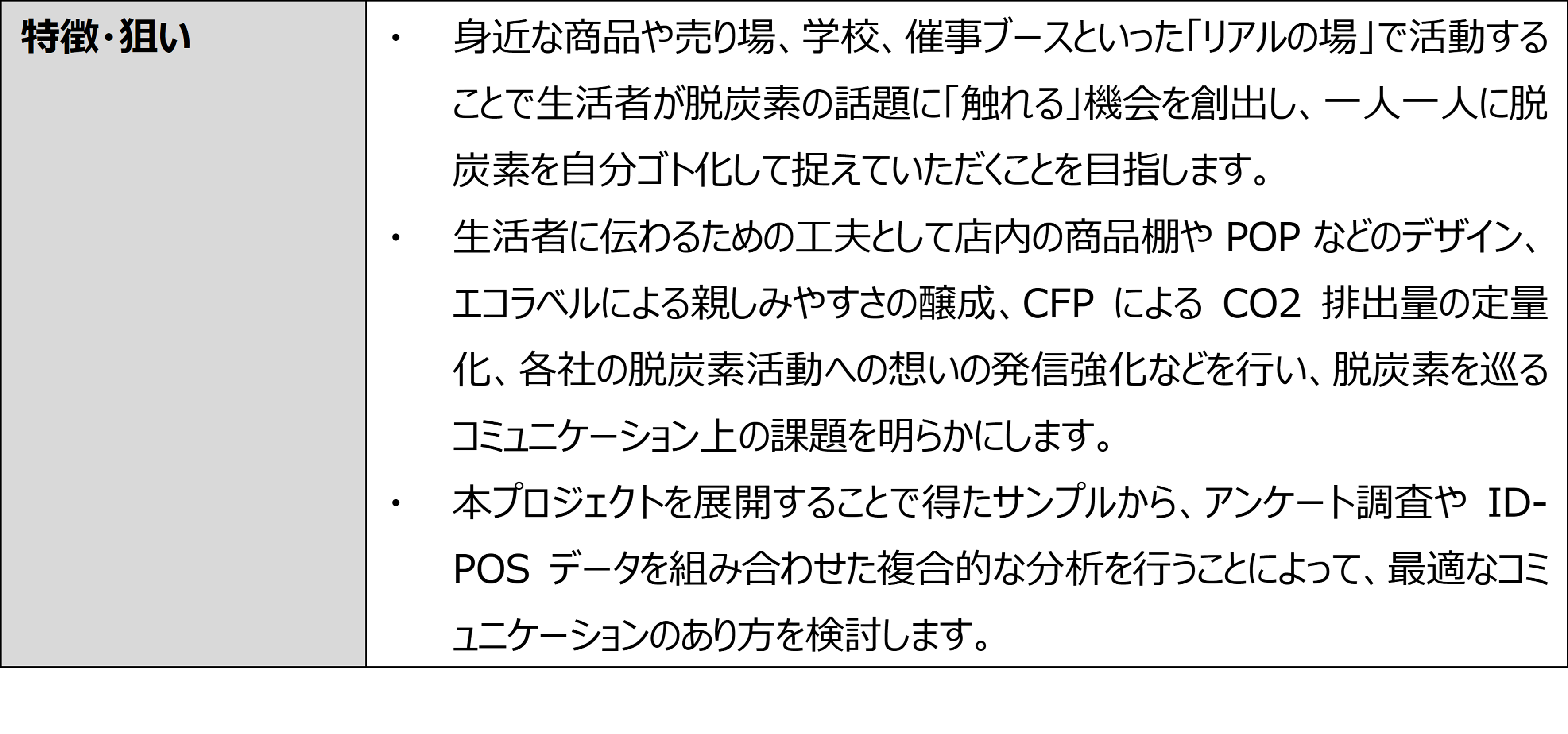 今後、アンケート調査やID-POSデータ分析を組み合わせ、CCNC参加企業の脱炭素に係る商品開発や販促施策の検討や、エコラベルやCFPの表示・普及のあり方の課題抽出などに利用していきます。