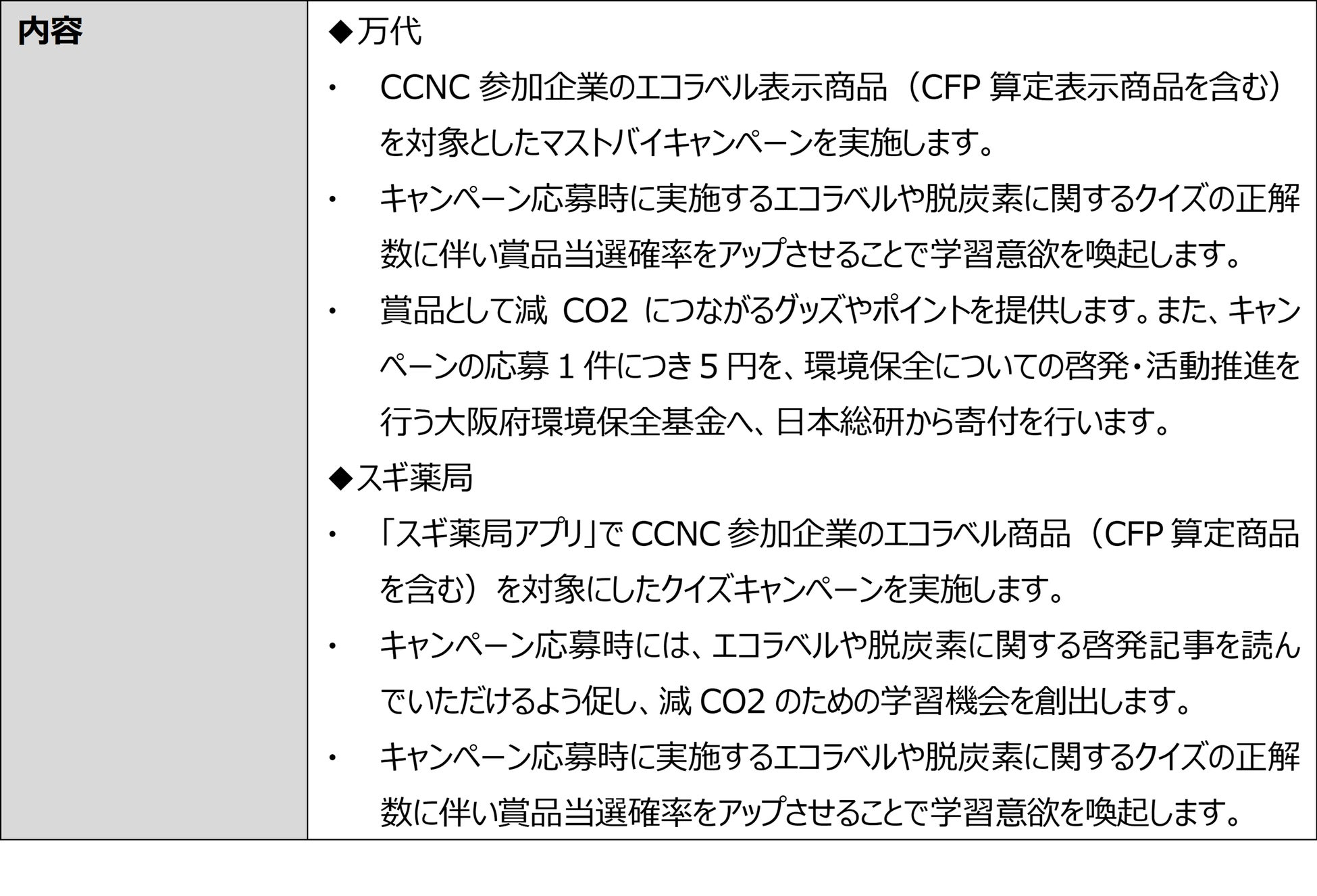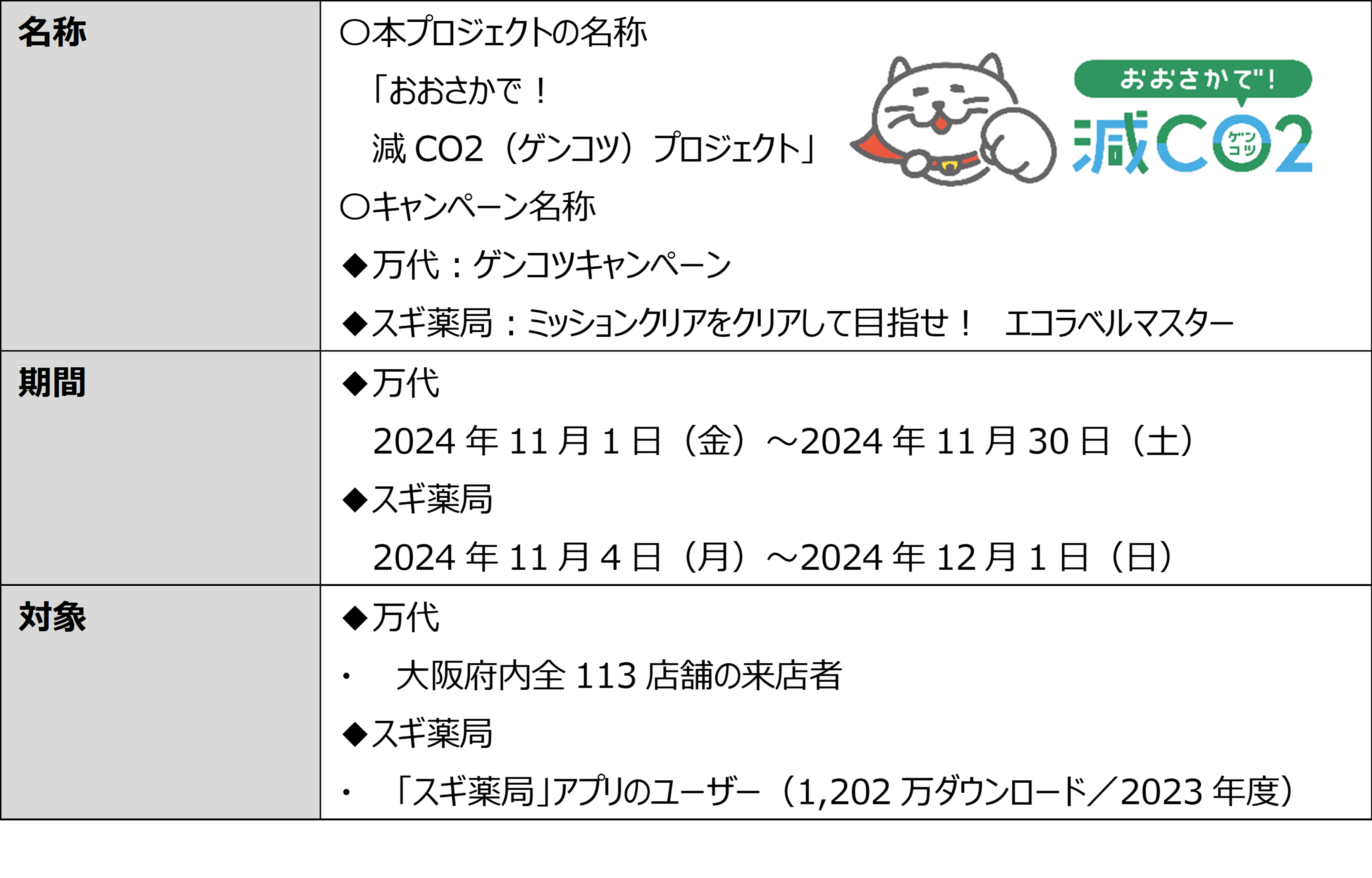 生活者の脱炭素への意識・行動変容を促すことで、企業の脱炭素の取り組みを加速させ、脱炭素社会を構築することを目指し全15社が参画する「チャレンジ・カーボンニュートラル・コンソーシアム(Challenge Carbon Neutral Consortium)」(以下「CCNC」)は、2024年11月から、株式会社万代(以下「万代」)の大阪府内全113店舗と、株式会社スギ薬局(以下「スギ薬局」)が運営する「スギ薬局アプリ」で、生活者の脱炭素に配慮した購買行動を促すプロジェクト「おおさかで!減CO2(ゲンコツ)プロジェクト」(以下「本プロジェクト」)を開始します。