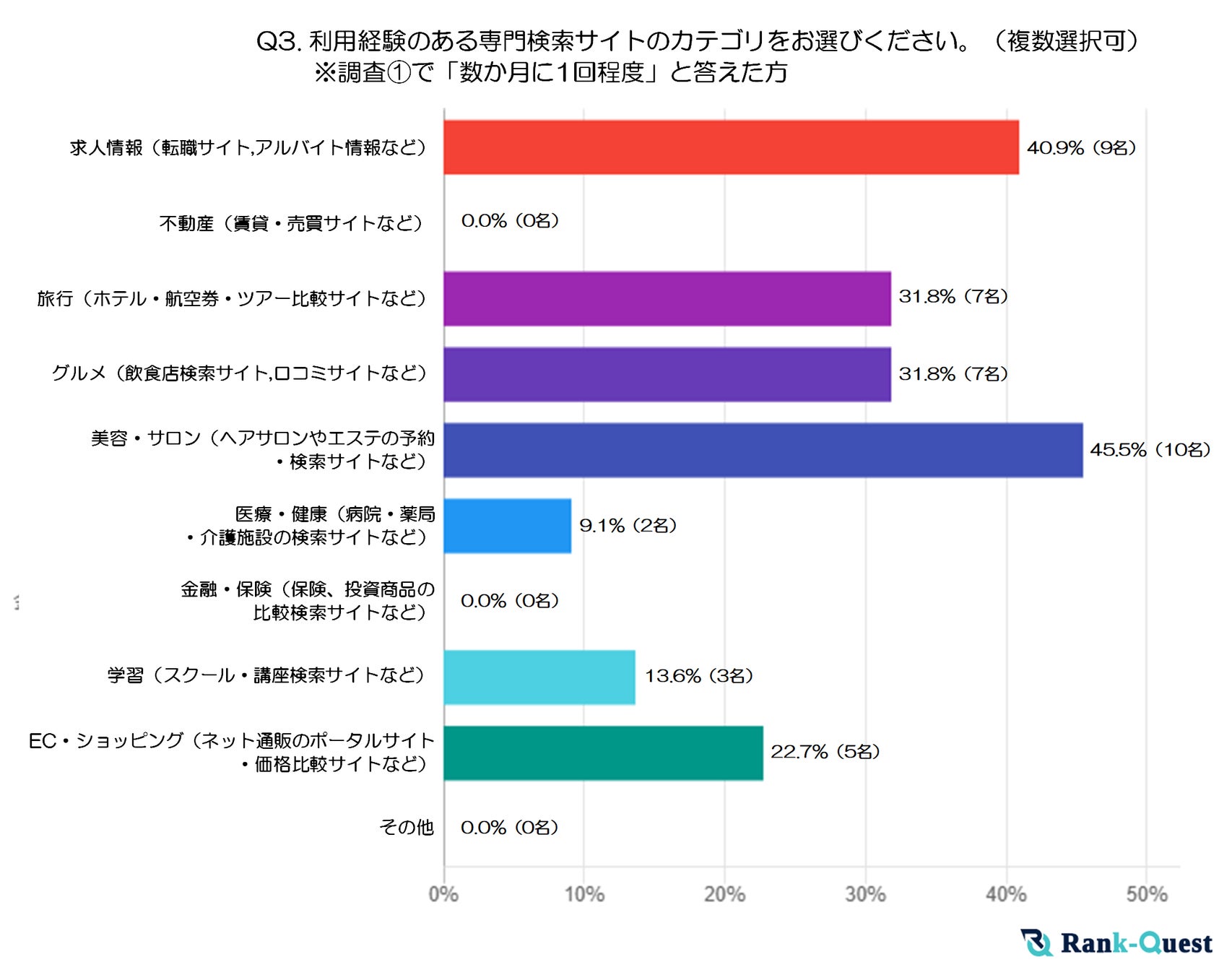 最も多かったカテゴリーは「美容・サロン(ヘアサロンやエステの予約・検索サイトなど)」で45.5%でした。今回の結果は、調査①で「数か月に1回程度」と回答した、比較的“たまに”専門検索サイトを利用する層を対象にしている点が特徴です。