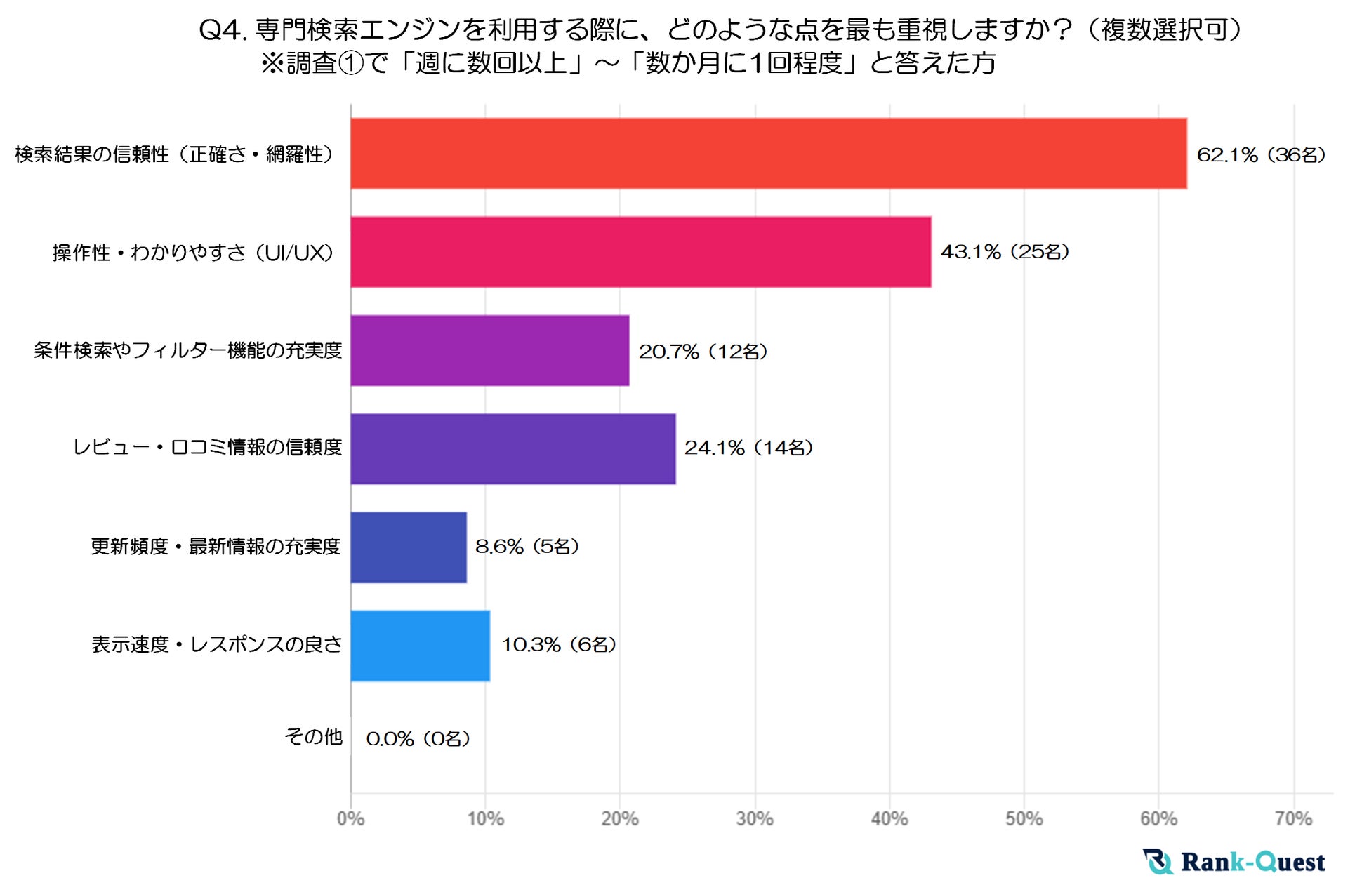 調査結果④:専門検索エンジンを利用する際に、どのような点を重視しますか?[複数選択可(注4)]※ 調査①で「週に数回以上」~「数か月に1回程度」と答えた方のみ回答