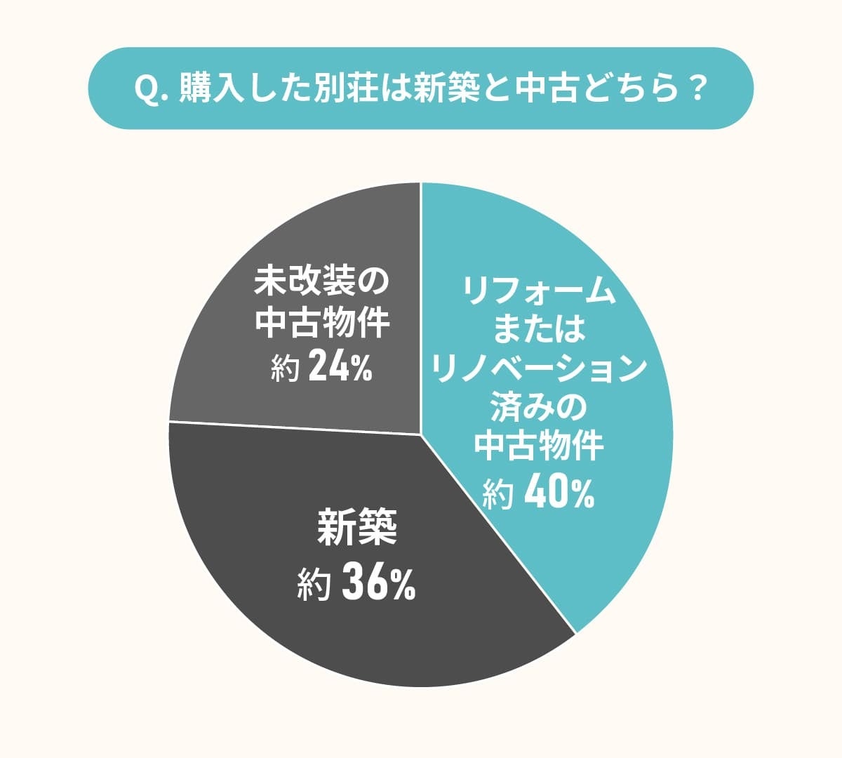 最多は「リフォームまたはリノベーション済みの中古物件」の約40%でした。「新築」「未改装の中古物件」を購入した人も一定数いました。