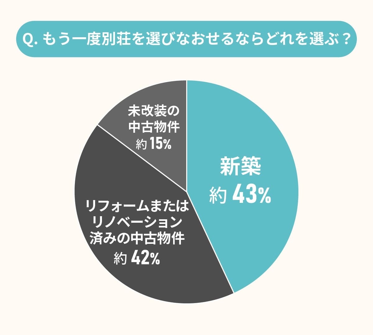 回答者に、もう一度別荘を購入できるなら、、「新築」と「中古(リフォーム・リノベ済み)」、「中古(未改装)」のどれを選びたいか本音を聞いてみました。