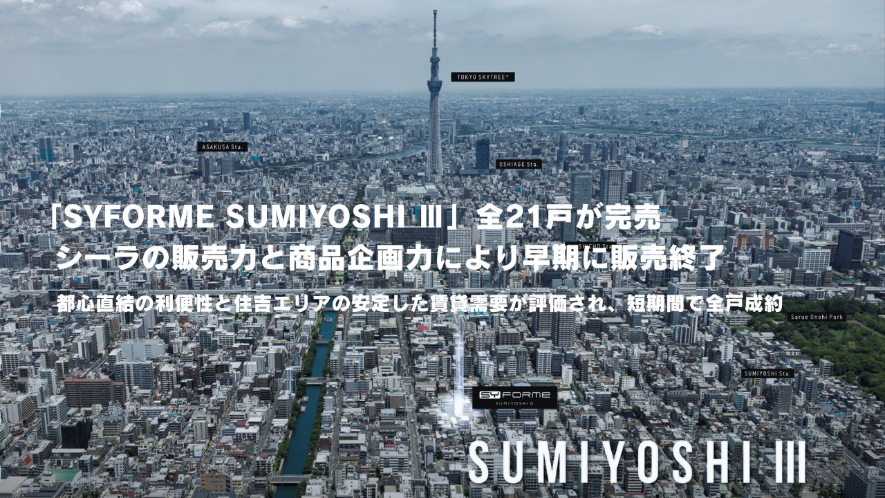 株式会社シーラホールディングス(本社:東京都渋谷区、代表取締役会長CEO:杉本宏之、証券コード:8887、以下「当社」)のグループ会社である株式会社シーラ(本社:東京都渋谷区、代表取締役:湯藤 善行、以下「シーラ」)は、新築分譲マンション「SYFORME SUMIYOSHI Ⅲ(シーフォルム住吉Ⅲ)」全21戸の販売が完了し、決済・引渡しもすべて滞りなく行われたことをお知らせいたします。