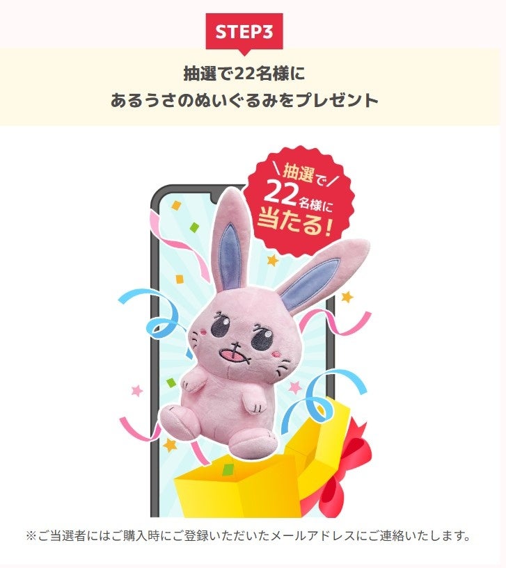 昨年の2周年記念に実施した「あるうさぬいぐるみフォト選手権」では、多くの参加者にご好評いただき、あるうさぬいぐるみは大変な人気を誇りました。お客様からいただいた喜びの声や追加リクエストにお応えし、3周年を迎える今年も引き続き、あるうさぬいぐるみをプレゼントいたします。