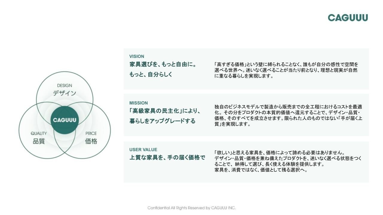 止まらないインフレにより生活コストが増大する現代において、家具選びは「高価なブランド品」か「安価な消耗品」かの二極化に直面しています。CAGUUUはこの課題に対し、独自のビジネスモデルで「良いものを買って、長く使う」という本質的な豊かさを提供し、急成長を続けています。