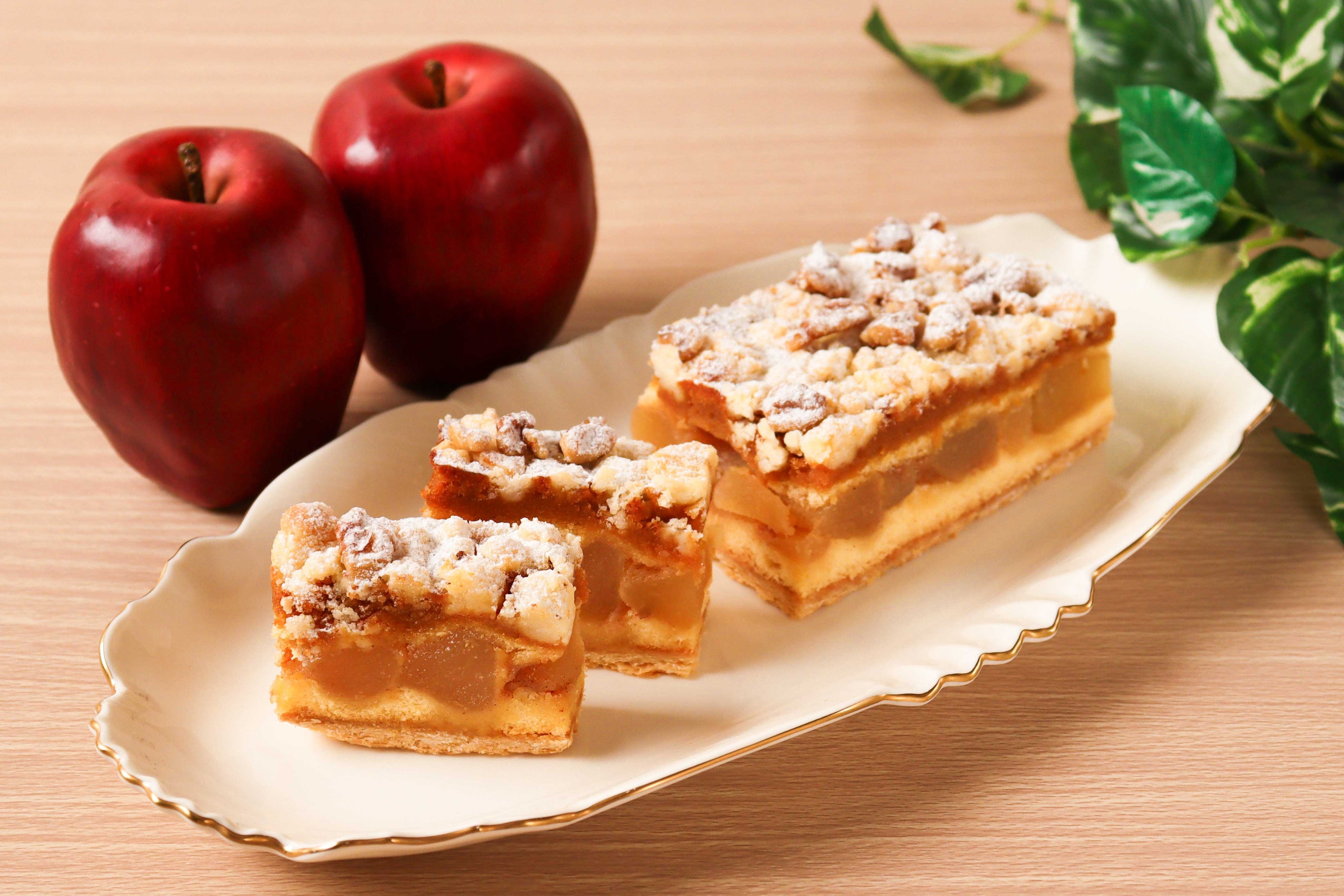 昨年11月の下鴨本店リニューアルオープン記念商品として販売した「彩りアップルパイ」をさらに進化させ、見た目や味、さらに食感も楽しんでいただけるアップルケーキをご用意しました。パイ生地にスポンジと紅玉りんご、キャラメルアーモンドクリームを重ね、表面はクルミを加えたクランブルクッキーで仕上げました。大きなりんごのごろっとした食感と、ザクザクとしたクランブルクッキー、まろやかなキャラメルアーモンドクリームが調和した奥深い味わいをお楽しみいただけます。