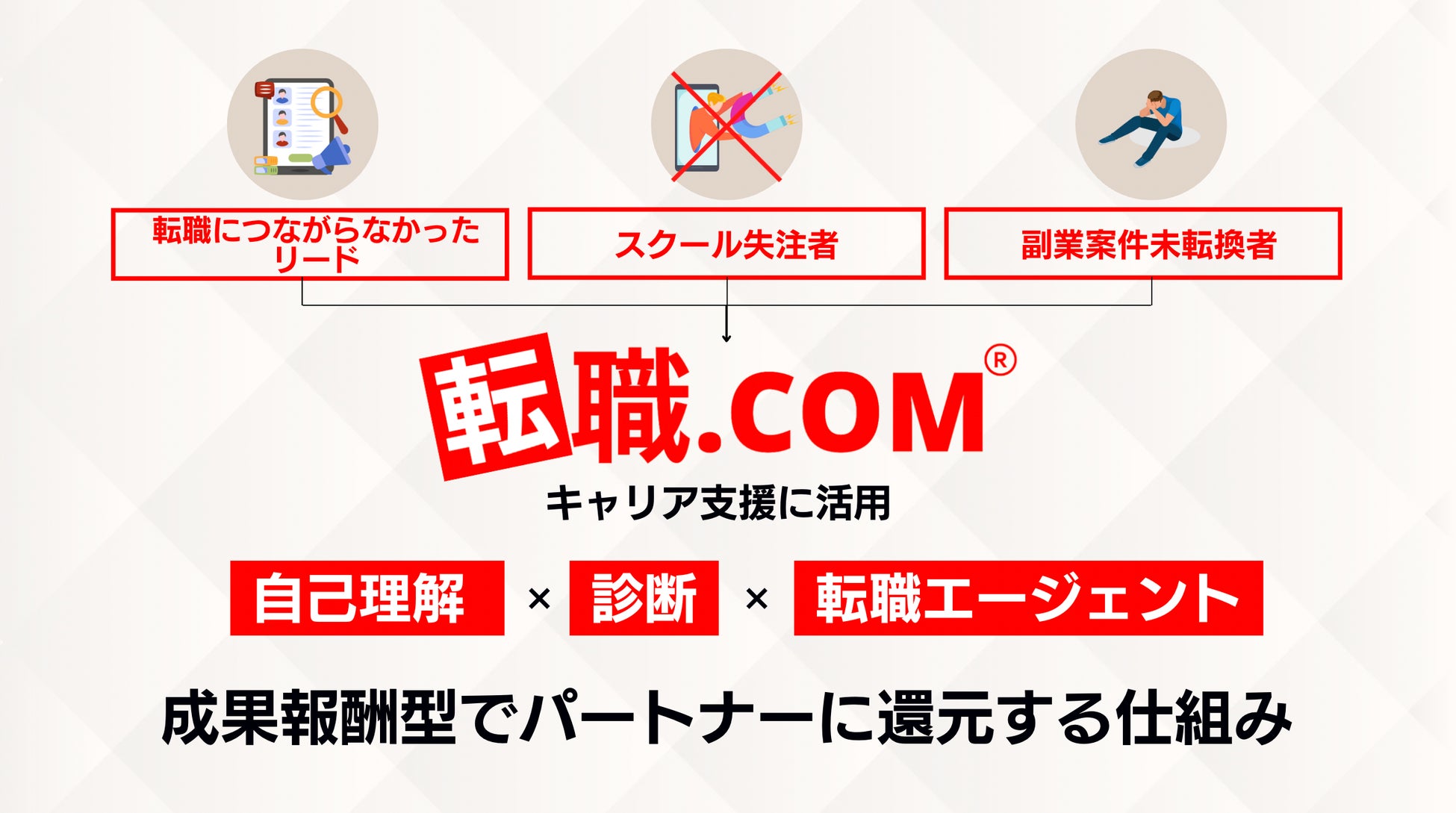 本制度は、「スクール失注者」「副業案件未転換者」などのいわゆる“失注者”を、転職.comが引き受け、キャリア支援に活用するBtoB連携モデルです。